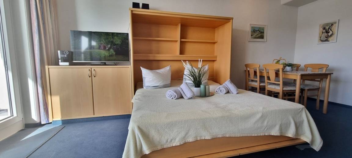 Der kombinierte Wohn- und Schlafbereich ist kompakt gestaltet und verfügt über ein praktisches Doppelschrankklappbett, das tagsüber für mehr Platz sorgt und abends komfortablen Schlaf bietet. Eine gemütliche Sitzecke lädt zum Entspannen ein und sorgt für eine angenehme Wohnatmosphäre.