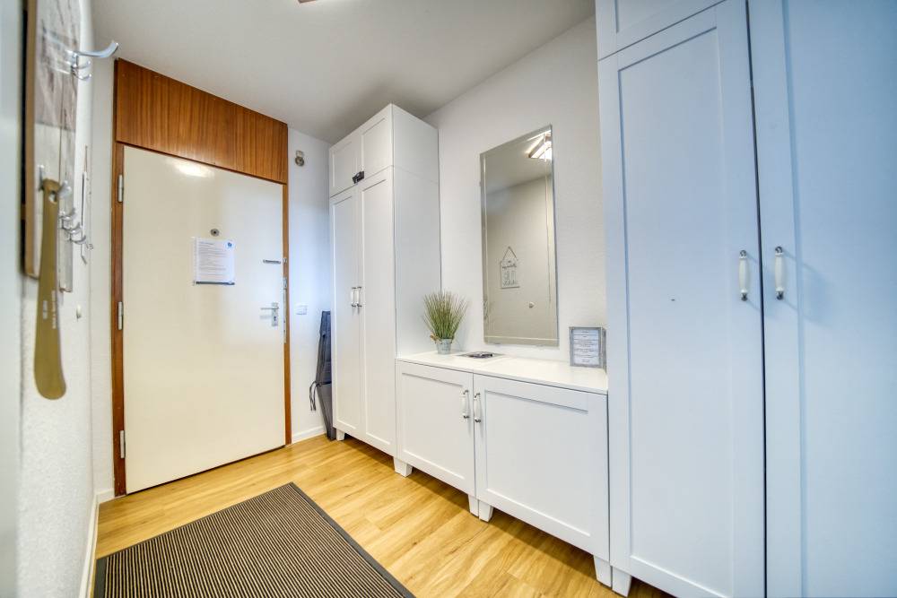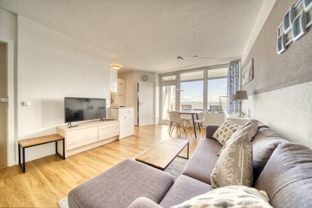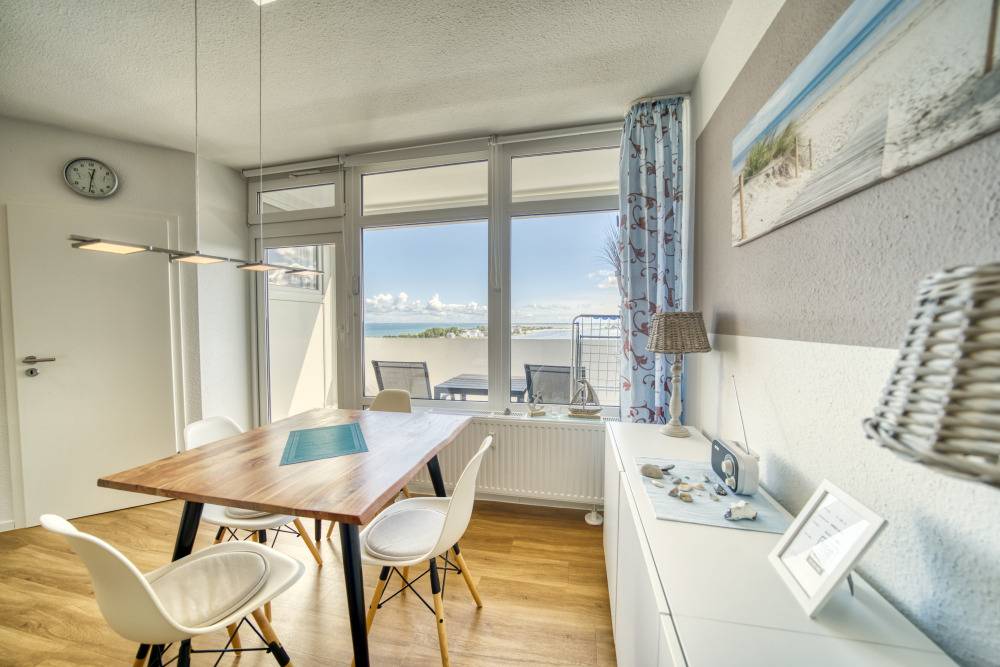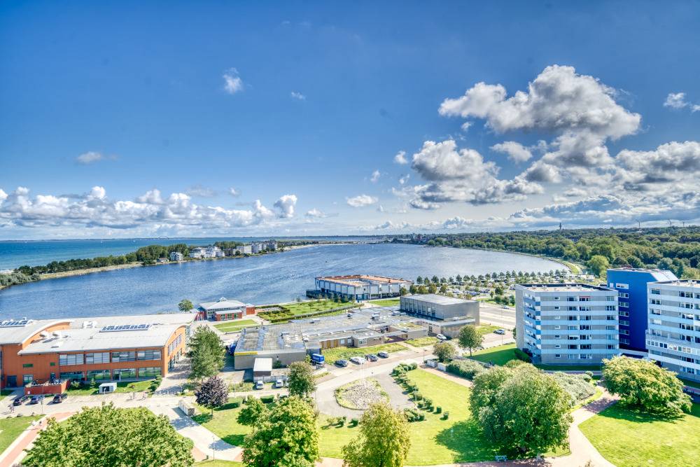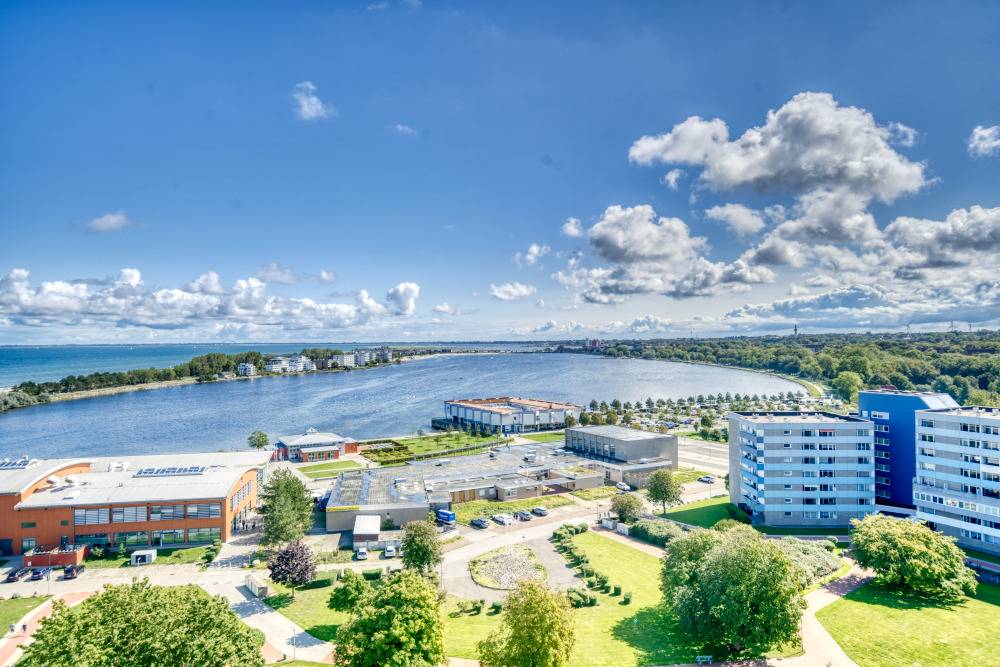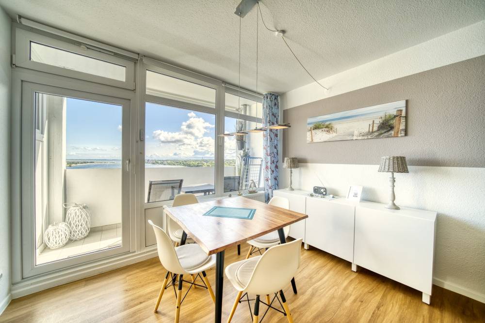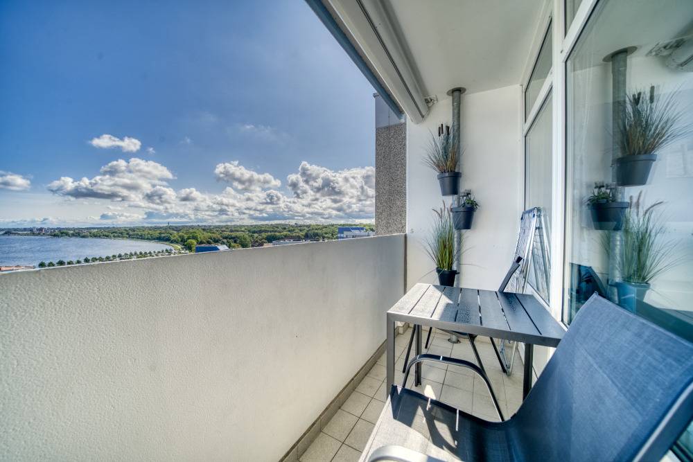 Die Wohnung liegt im Haus F Ferienpark, in der 13. Etage. Der Balkon zum Innenhof lädt zum Frühstück in der Sonne ein und bietet einen herrlichen Blick auf Binnensee und Ostsee bis zur Fehmarnsundbrücke.