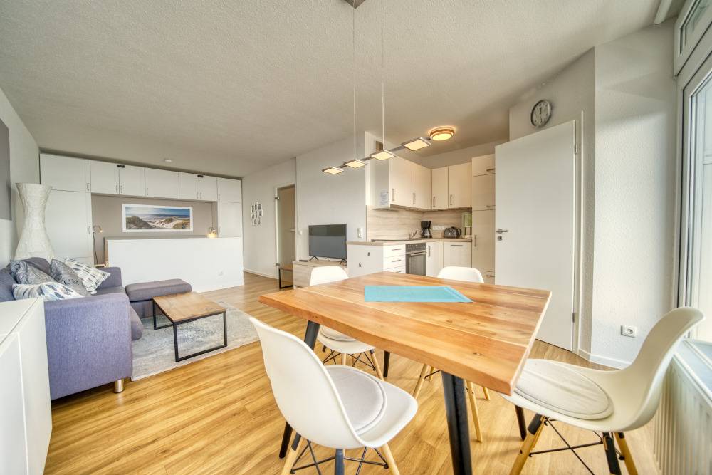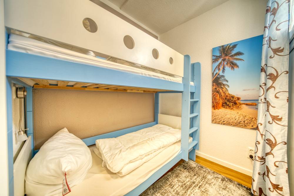 Die 45 m² große Ferienwohnung bietet Wohn-/Essbereich mit TV, Blu-ray und Radio, Schlafbereich mit Doppelbett, Kinderzimmer mit Etagenbett und eine offene, voll ausgestattete Küche (Kühlschrank, 4-Plattenherd, Backofen, Spülmaschine, Kaffeemaschine, Wasserkocher, Toaster). Bad mit WC, Dusche und Föhn. Balkon mit Markise, Kinderstuhl sowie Spiele, Puzzle und Bücher. WLAN inklusive. Nichtraucher, keine Haustiere, Fahrstuhl, Fahrradräume, ca. 300 m zum Strand, Parkplatz hinter dem Ferienpark. Ideal für Familien.