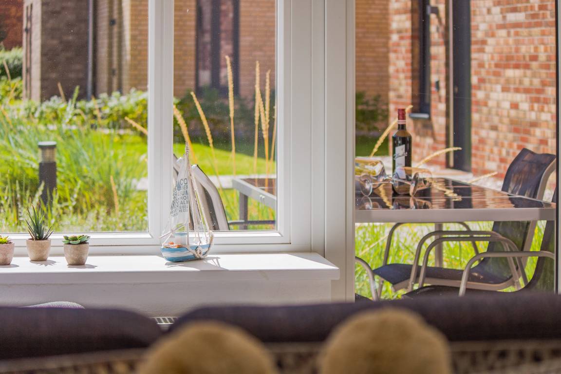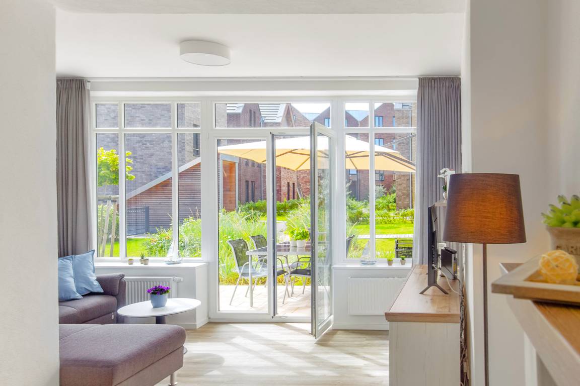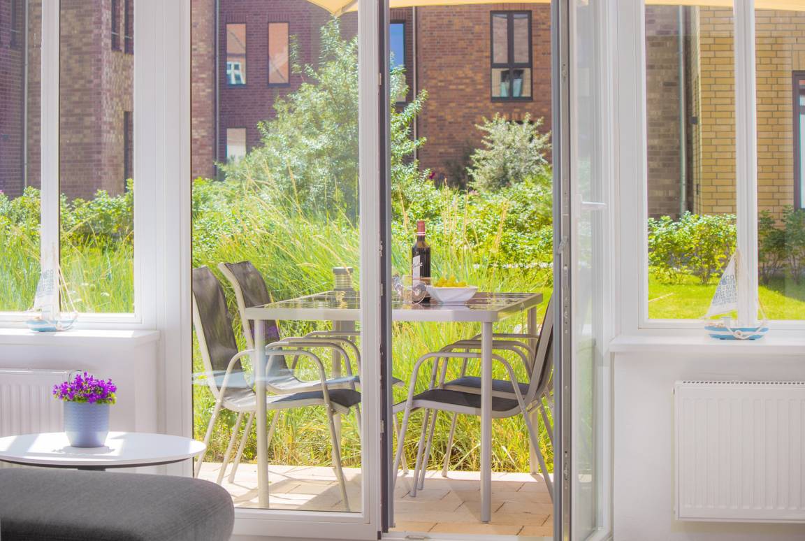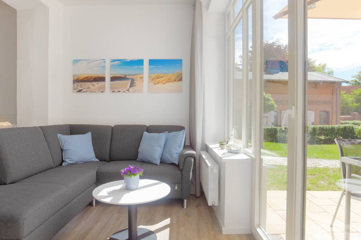 Der geschmackvolle Wohnbereich ist offen gestaltet und mit einer gemütlichen Couch, Smart-TV und WLAN ausgestattet – perfekt für entspannte Stunden mit Streaming-Möglichkeiten. Große Fenster bringen viel Tageslicht in die Wohnung und ermöglichen einen direkten Blick ins Fischerdorf Heiligenhafen.