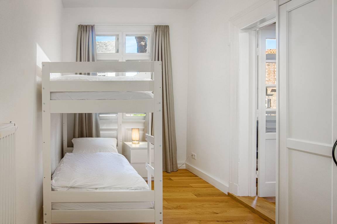Die Ferienwohnung ist besonders für Familien geeignet, da sie über zwei Schlafzimmer verfügt. Das erste Schlafzimmer ist mit einem Doppelboxspringbett (180x200) ausgestattet und beeindruckt mit historischem Stuckdekor und einem Kamin (nicht nutzbar). Dieses Zimmer dient als Durchgangszimmer zum zweiten Schlafzimmer, das über ein Etagenbett (je 90x200) verfügt. Blickdichte Plissees und Vorhänge sorgen für eine angenehme Verdunkelung und eine erholsame Nachtruhe. Allergiker-geeignete Bettwäsche, Handtuchsets, ein Babyreisebett (ohne Bettzeug) und ein Hochstuhl können gegen Gebühr hinzugebucht werden.