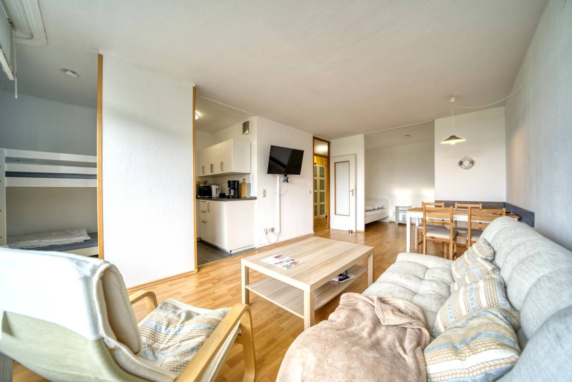 Wohn-Esszimmer, Schlafbereich mit Einzelbetten, Kinderzimmer mit Etagenbett, funktionale Küche mit Kühlschrank, Bad mit WC und Duschkabine, TV im Wohnzimmer, Balkon. Kostenloses WLAN. Nichtraucherwohnung, haustierfrei, max. 4 Personen. Kostenfreier Parkplatz, Strand ca. 300 m entfernt. Ideal für Familien, die Sonne, Strandnähe und Freizeitangebote wie Aktiv-Hus, Schwimmbad, Sauna und Kinderspielwelt genießen möchten.