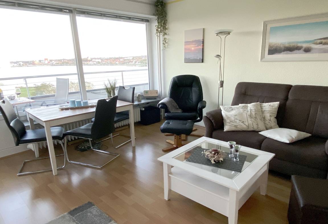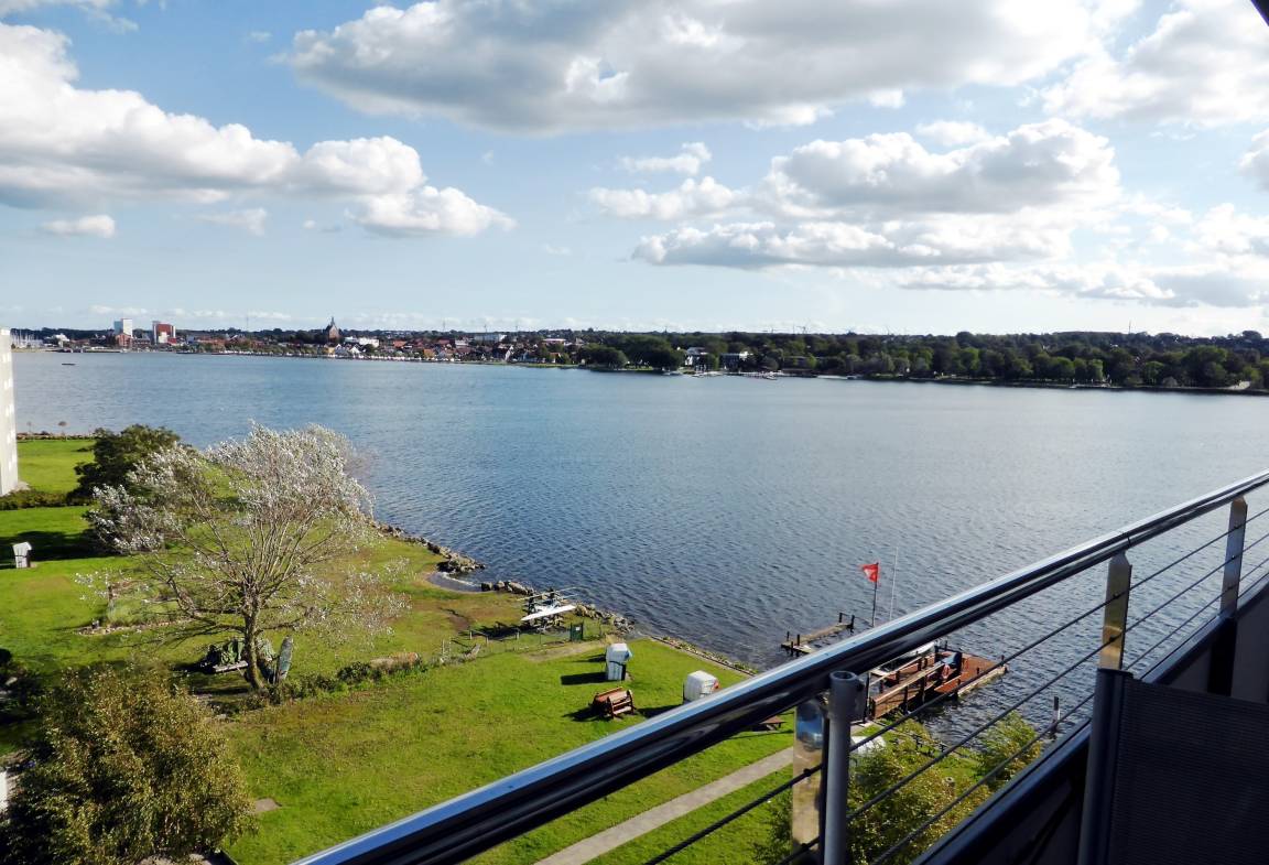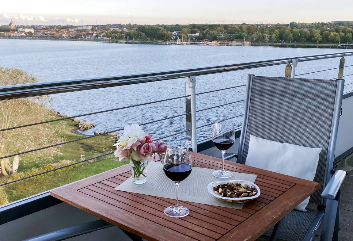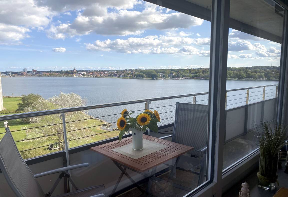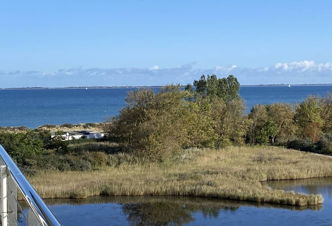 Ein absolutes Highlight der Wohnung ist der möblierte Balkon. Von hier aus genießen Sie einen traumhaften Panoramablick über den Binnensee mit der Silhouette von Heiligenhafen im Hintergrund, über ein angrenzendes Biotop bis hin zur Ostsee und der Insel Fehmarn. Dieser Ausblick macht den Balkon zu einem besonderen Rückzugsort – ideal für entspannte Stunden bei frischer Seeluft.