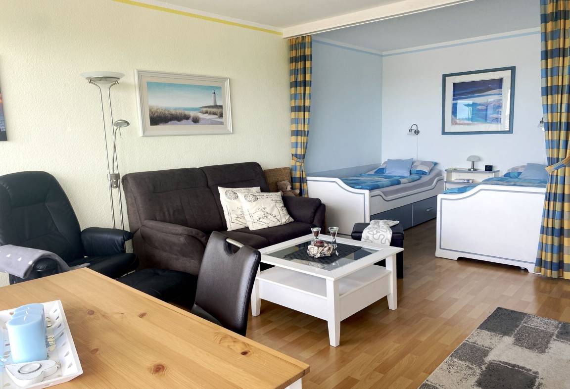 Herzstück der Wohnung ist der helle Wohn- und Schlafbereich, der offen und einladend gestaltet ist. Große, bequeme Kojenbetten sorgen für erholsame Nächte, während der Raum tagsüber zum Entspannen und Verweilen einlädt. Dank elektrischer Rollläden genießen Sie sowohl optimale Verdunkelung als auch angenehmen Sonnenschutz. Zur Unterhaltung stehen Ihnen ein Smart-TV, DVD-Player, Radio, CD-Player sowie WLAN zur Verfügung. Ein Tresor ergänzt den Wohnkomfort.