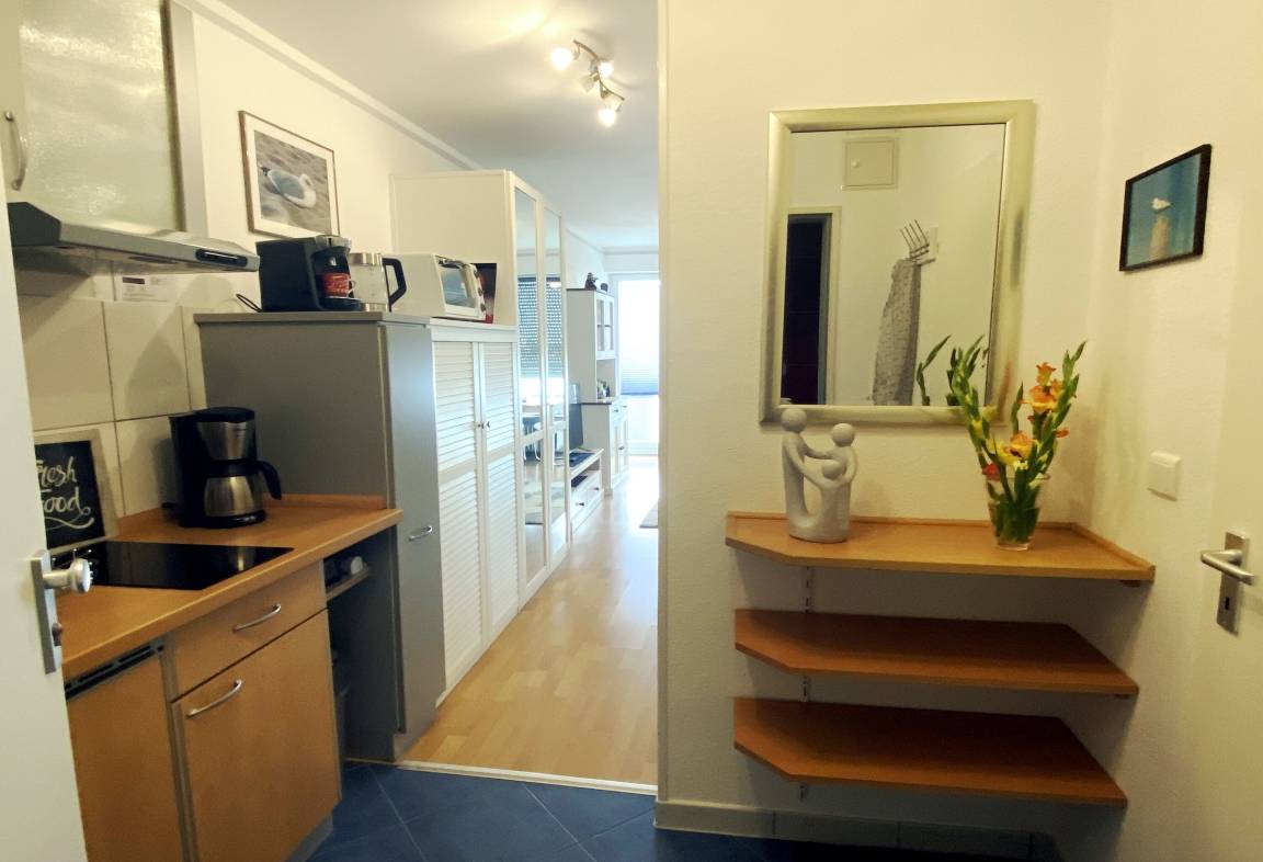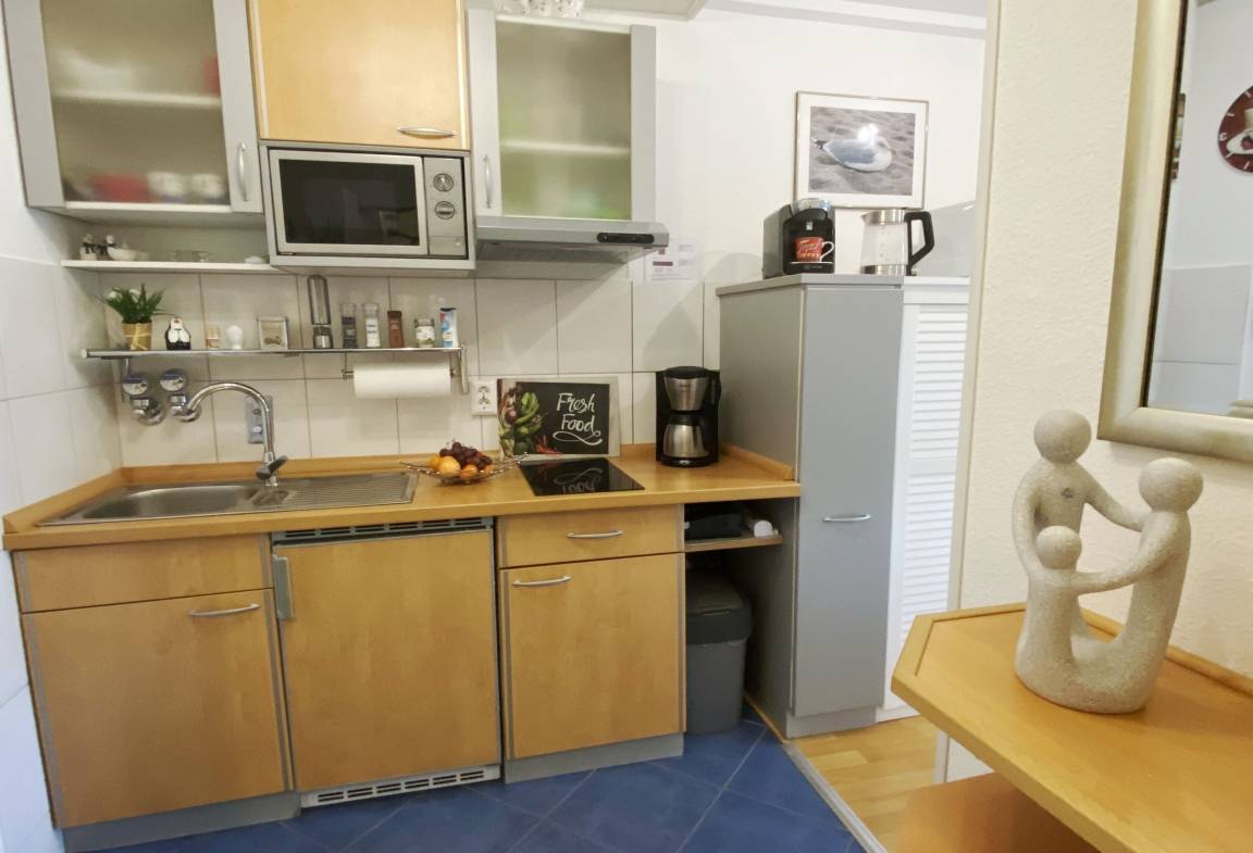 Die Einbauküche ist vollständig eingerichtet und bietet alles, was Sie für die Selbstversorgung im Urlaub benötigen. Ob ein entspanntes Frühstück oder ein leichtes Abendessen – hier lassen sich Mahlzeiten unkompliziert zubereiten.