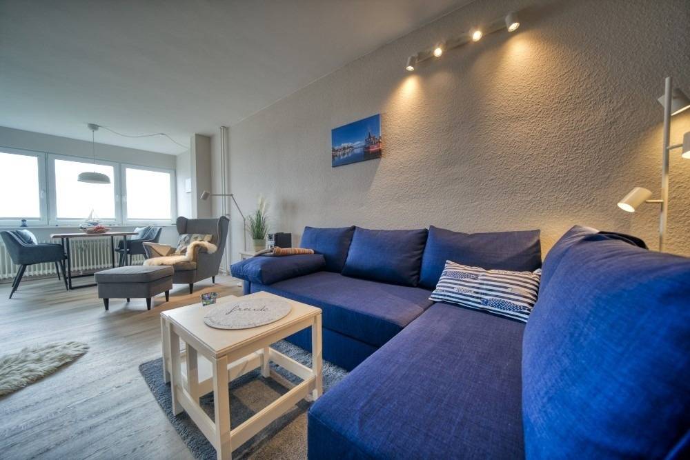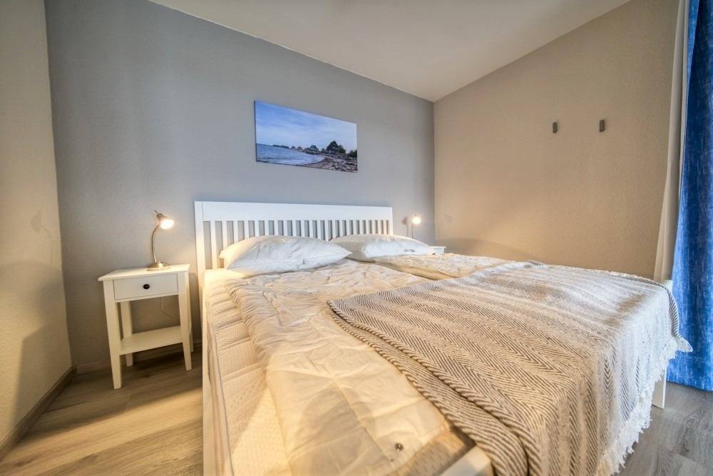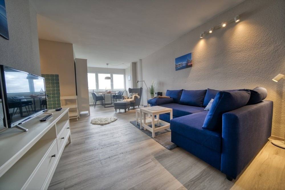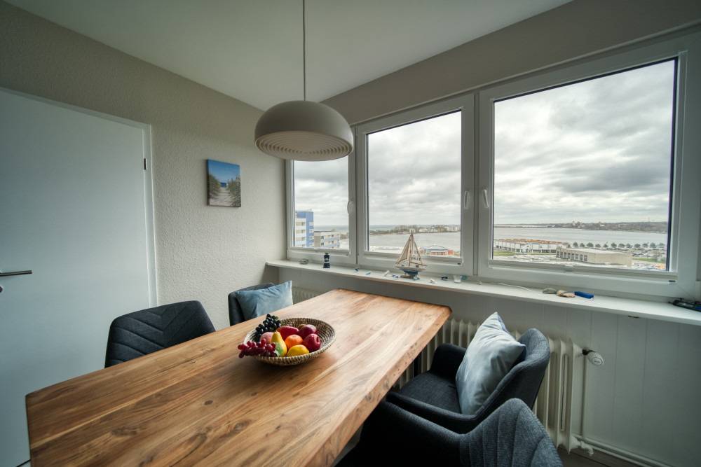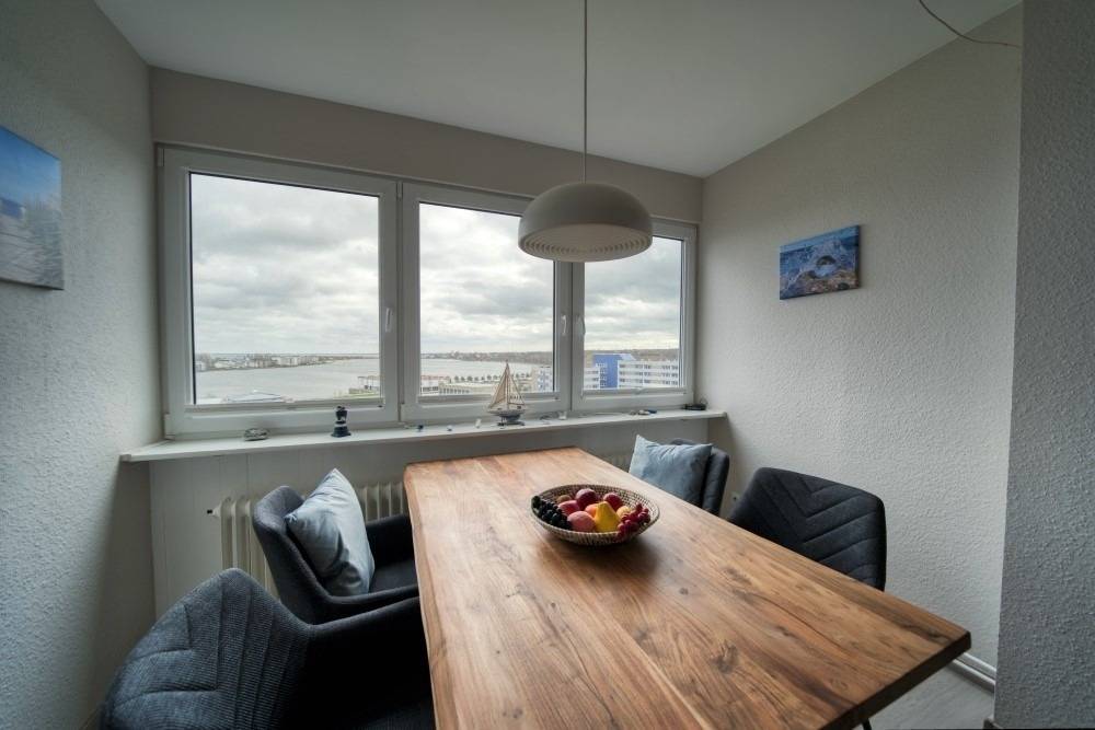 Genießen Sie Ihren Urlaub in dieser frisch renovierten Ferienwohnung im Haus F des beliebten Ferienparks Heiligenhafen. Die 2023 modernisierte Wohnung in der 9. Etage bietet auf 53 m² einen beeindruckenden Panoramablick auf Ostsee, Fehmarnsundbrücke und Binnensee. Wohn-/Esszimmer mit Sitzecke und Flachbild-TV, separates Schlafzimmer mit Doppelbett, Kinderzimmer mit zwei Einzelbetten. Küche komplett ausgestattet mit 4-Plattenherd, Kühlschrank, Toaster, Kaffeemaschine, Wasserkocher und Geschirr. Bad mit Dusche/WC, Vinylboden, kostenloses WLAN. Ca. 300 m zum Strand, Parkplatz hinter dem Ferienpark, Fahrstuhl und Fahrradräume vorhanden. Nichtraucher, keine Haustiere.