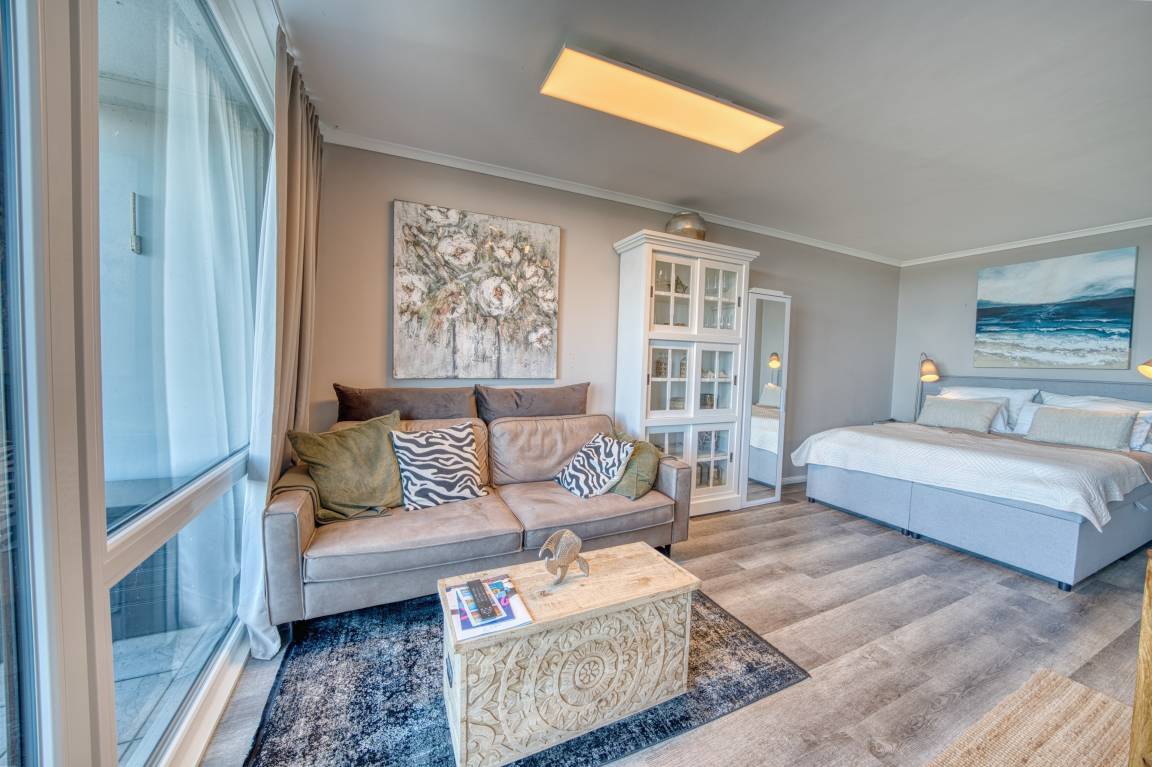 Wohn-/Schlafzimmer mit Doppelbett, Ecksofa [&] Flachbild-TV