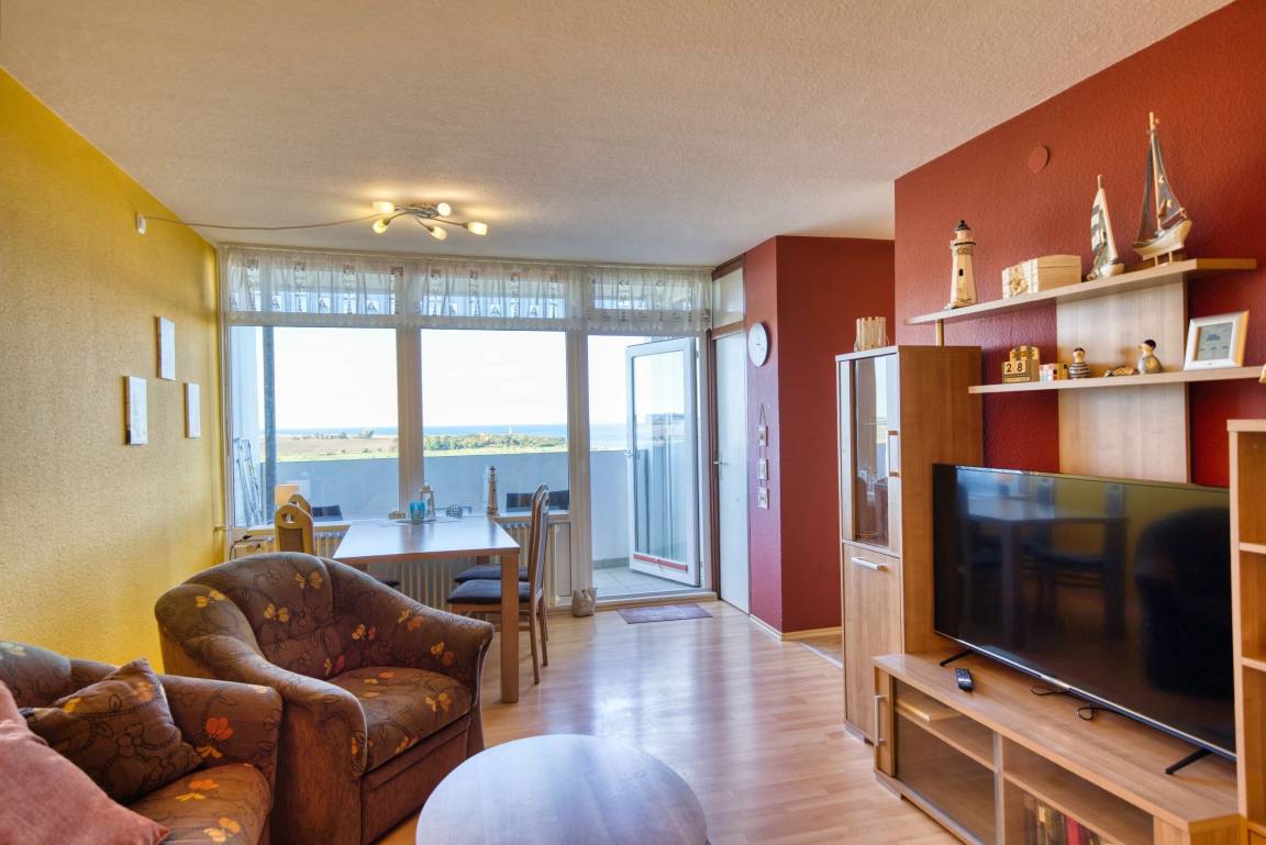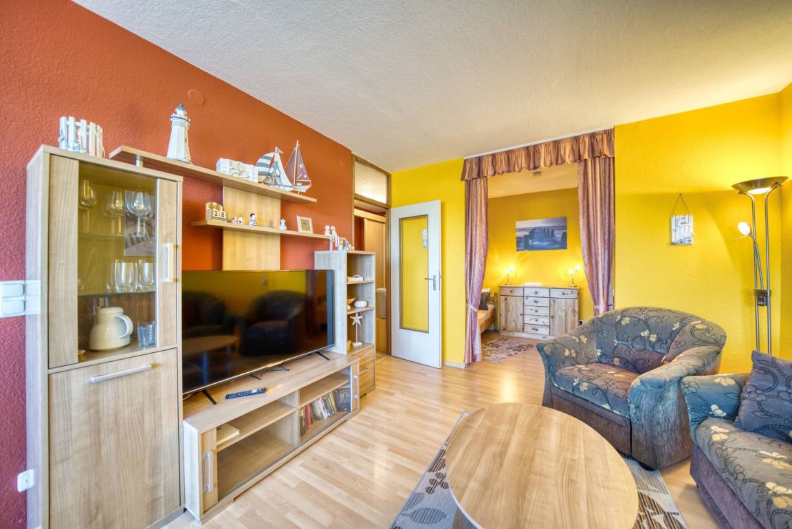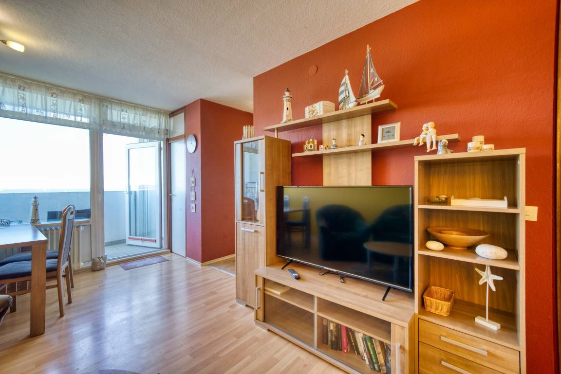 Wohnfläche ca. 45 qm. Wohn-Esszimmer, Elternschlafraum mit Einzelbetten, separates Kinderzimmer mit Einzelbett. Küche komplett ausgestattet mit 4-Platten-Herd, Mikrowelle und Kühlschrank mit Gefrierfach. Bad mit WC und Duschkabine. Flachbild-TV im Wohnzimmer. Nichtraucher, kein WLAN, keine Haustiere, Fahrstuhl zu jeder Etage, Fahrradräume vorhanden. Max. 3 Personen. Strand ca. 300 m, kostenfreier Parkplatz. Ferienpark mit Schwimmbad, Sauna, Wellness, Läden und Kinderspielwelt.