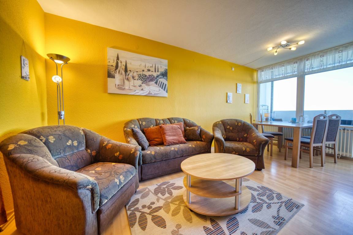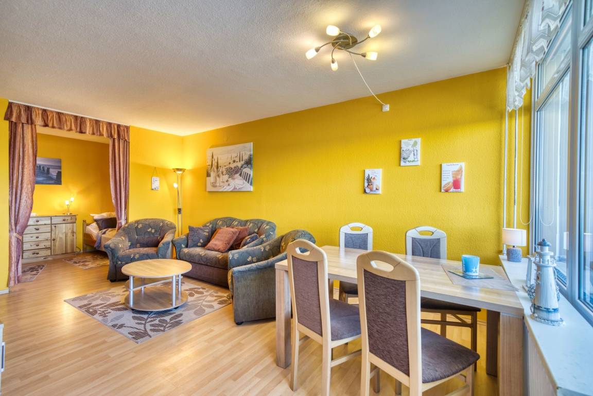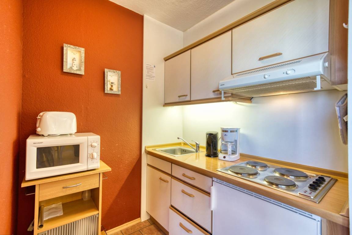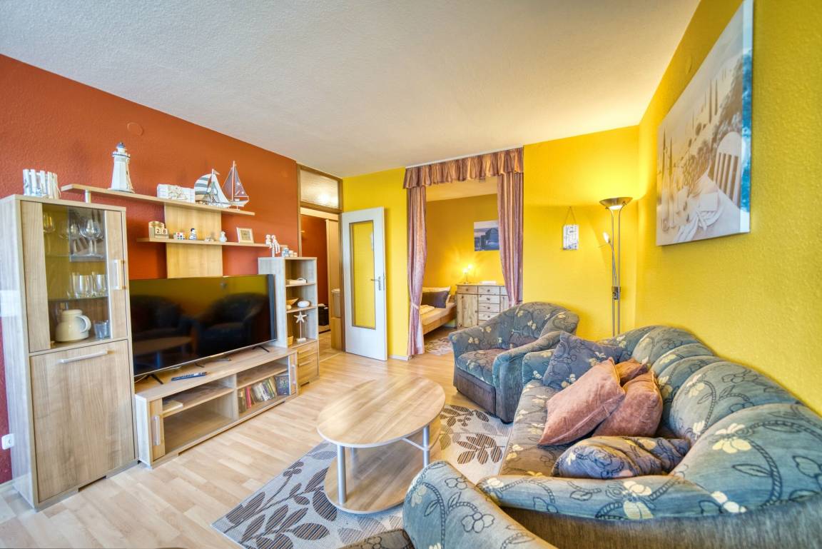 Wohnfläche ca. 45 qm. Wohn-Esszimmer, Elternschlafraum mit Einzelbetten, separates Kinderzimmer mit Einzelbett. Küche komplett ausgestattet mit 4-Platten-Herd, Mikrowelle und Kühlschrank mit Gefrierfach. Bad mit WC und Duschkabine. Flachbild-TV im Wohnzimmer. Nichtraucher, kein WLAN, keine Haustiere, Fahrstuhl zu jeder Etage, Fahrradräume vorhanden. Max. 3 Personen. Strand ca. 300 m, kostenfreier Parkplatz. Ferienpark mit Schwimmbad, Sauna, Wellness, Läden und Kinderspielwelt.