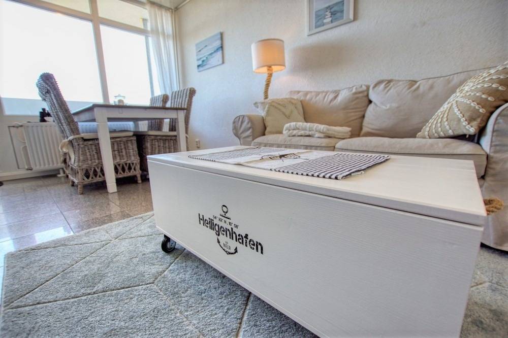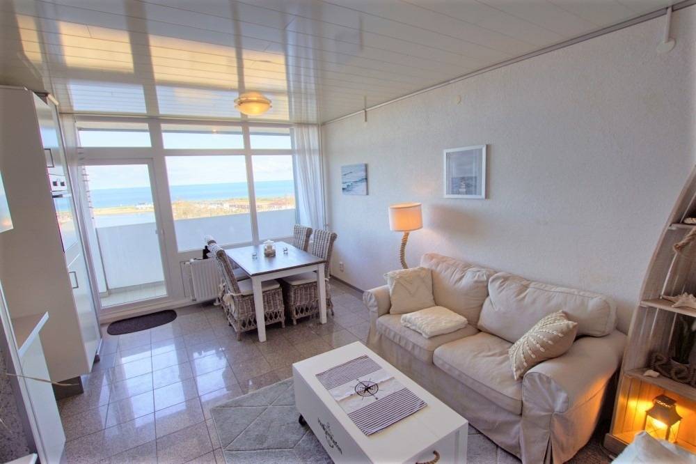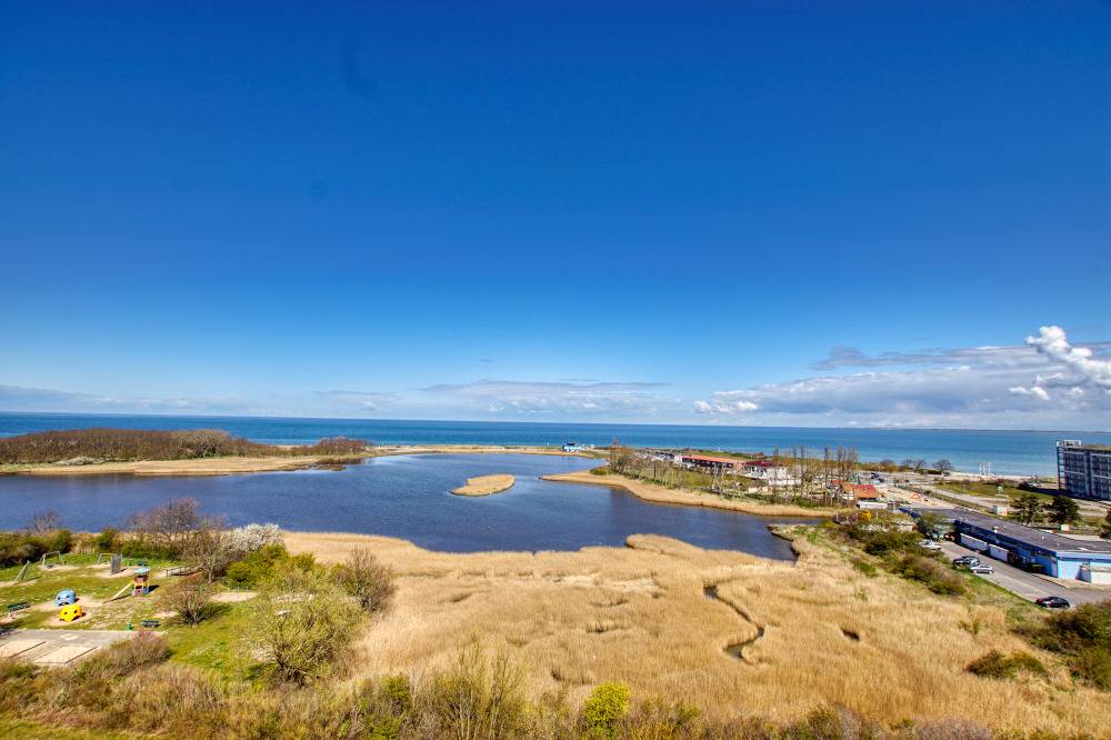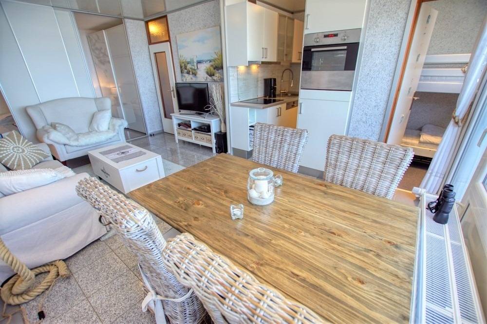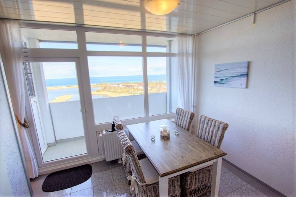Stilvoll maritim eingerichtete Ferienwohnung im 9. OG von Haus C mit herrlichem Ostseeblick vom Balkon oder Esstisch. Ca. 45 m² für bis zu 3 Personen. Wohn-/Schlafbereich mit Doppelbett, Sofa, Sessel, Smart-TV. Separates Schlafzimmer mit Etagenbett. Voll ausgestattete Küche: Cerankochfeld, Backofen, Mikrowelle, Kühlschrank mit Gefrierfach, Geschirrspüler. Bad mit Duschkabine, WC, Handtuchtrockner. Balkon mit Panorama. Strand ca. 300 m, Fahrstuhl, Parkplatz, WLAN inklusive, Nichtraucherwohnung, keine Haustiere, abschließbare Fahrradräume.
