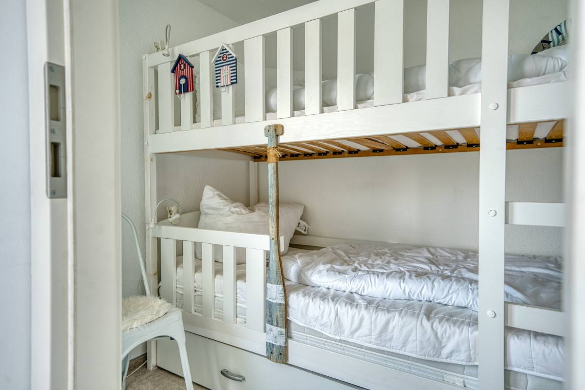 Die Wohnung ist bequem per Fahrstuhl erreichbar und ideal für Paare oder kleine Familien. Sie verfügt über ein Wohn-/Esszimmer mit gemütlicher Sitzecke, einen integrierten Elternschlafbereich mit Doppelbett sowie ein separates Kinderzimmer mit Hochbett und Verdunkelungsmöglichkeit. Flachbild-TV, Radio und kostenfreies WLAN sind vorhanden.