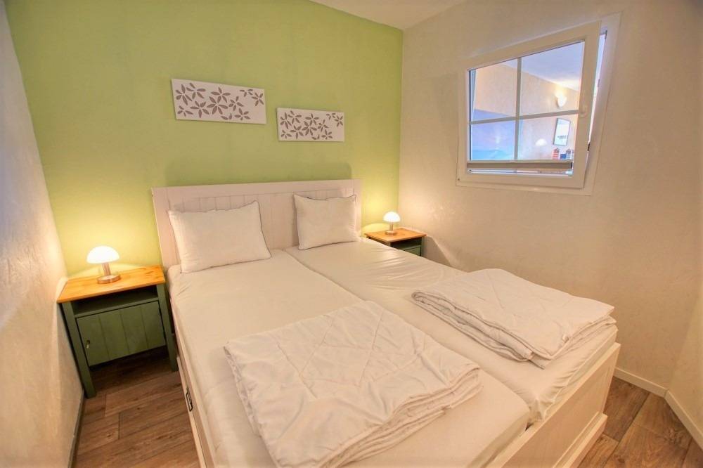 Die Wohnung verfügt über ein Wohn-Esszimmer mit Sitzecke, Essecke, Flachbild-TV und Radio, einen Schlafbereich mit Doppelbett sowie ein separates Kinderzimmer mit Etagenbett. Die voll ausgestattete Küche bietet Kühlschrank mit Gefrierfach und alle wichtigen Kochutensilien. Das Badezimmer ist mit Dusche, WC und Waschbecken ausgestattet.