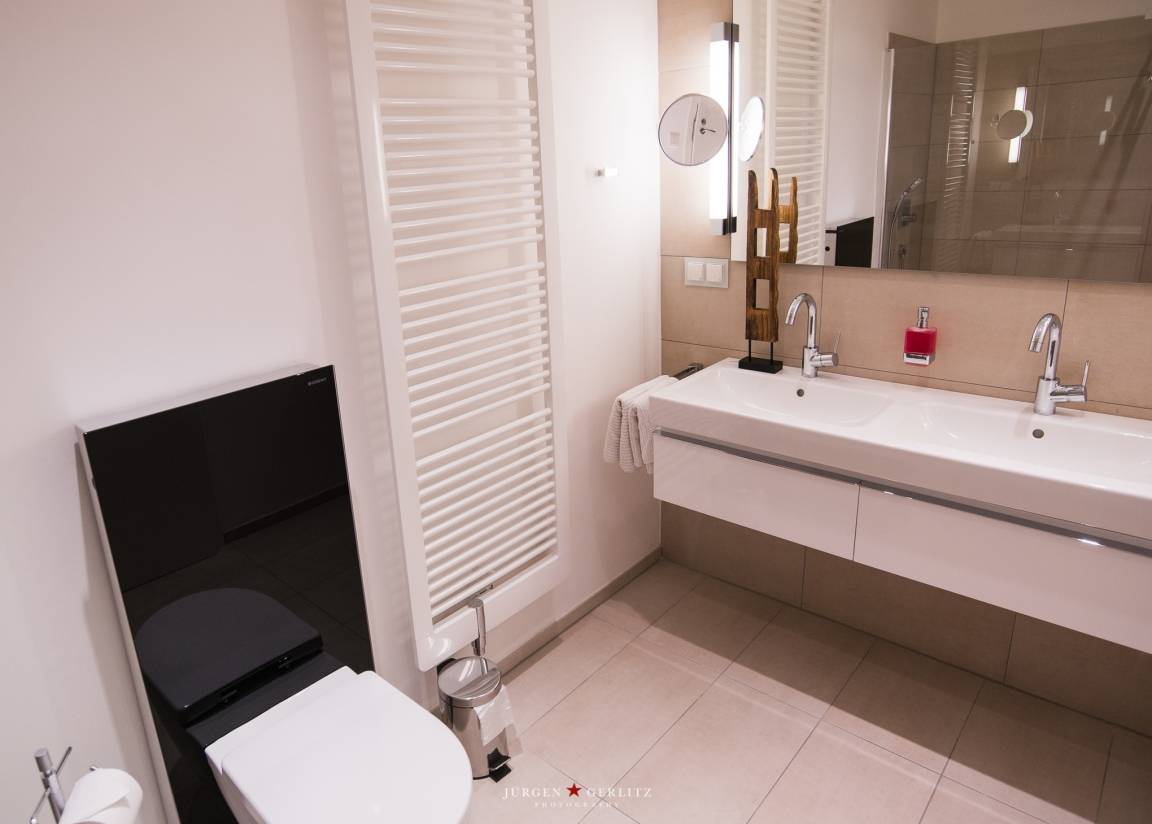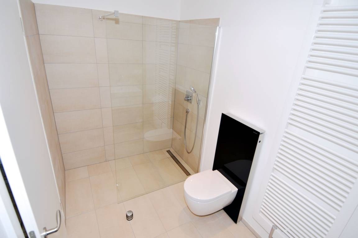 Das Badezimmer ist modern gestaltet und bietet eine einladende Dusche, während ein zusätzliches Gäste-WC für zusätzlichen Komfort sorgt. Gemeinsam mit dem offenen Wohn- und Essbereich, der dank Fußbodenheizung für ein angenehmes Raumklima sorgt, macht dies die Wohnung zu einem perfekten Rückzugsort nach einem langen Tag am Strand oder bei Erkundungstouren.