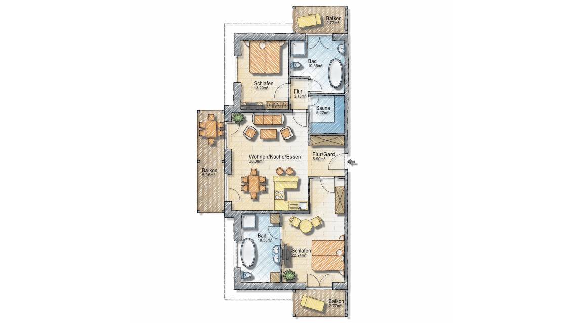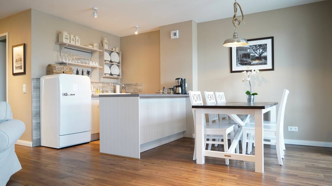 May we present: Unsere "Ocean House" Apartments mit Sauna. Auf 98 qm hat unser Kooperationspartner „Ocean House" seiner Kreativität freien Lauf gelassen und sowohl die offene Wohnküche als auch die beiden Schlafzimmer mit je einem Vollbad zu etwas ganz Besonderem gemacht.