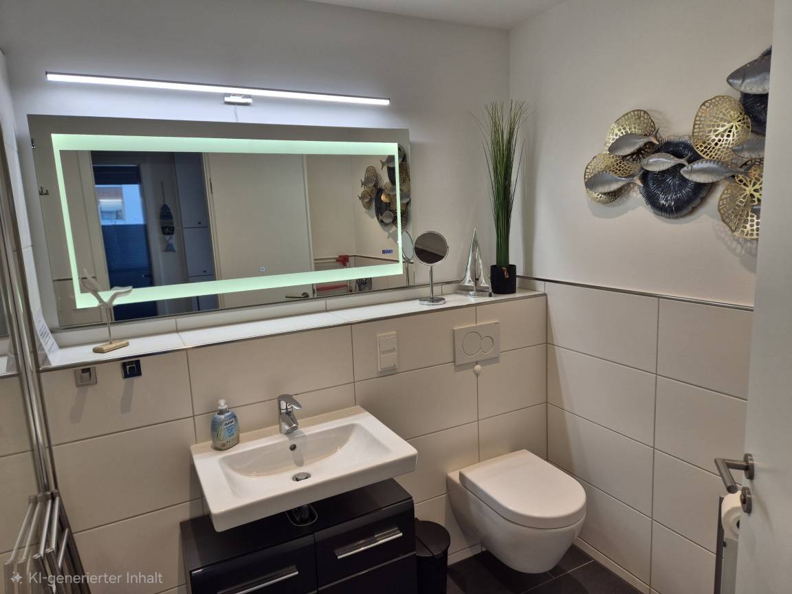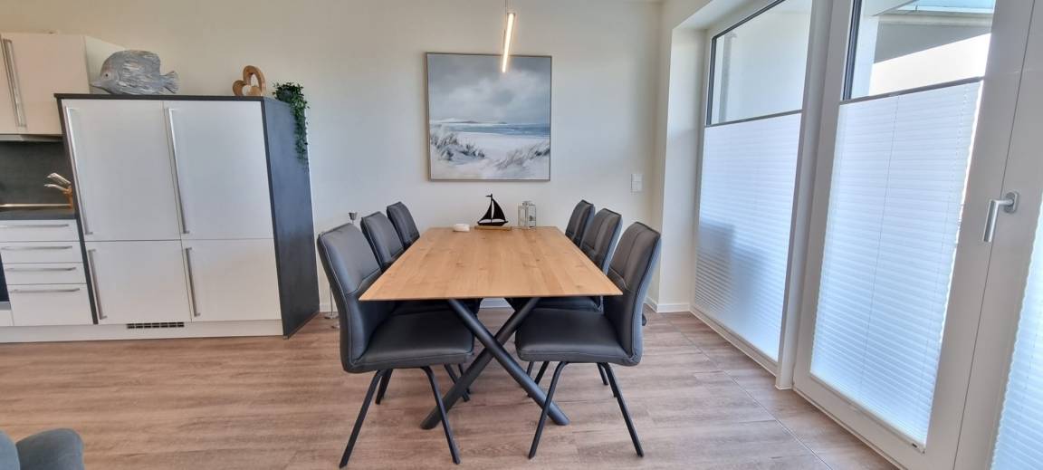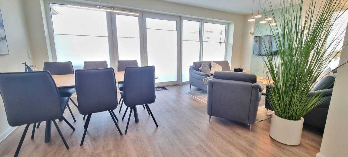 Die Ferienwohnung bietet Ihnen modernen Komfort und stilvolles Ambiente auf großzügiger Fläche. Der große Wohn- und Essbereich lädt zum Verweilen ein und ist mit einer offenen, voll ausgestatteten Küche ausgestattet. Hier finden Sie alles, was Sie für die Zubereitung von Mahlzeiten benötigen, von modernen Küchengeräten bis zu hochwertigem Geschirr. Das Wohnzimmer und das separate Schlafzimmer sind jeweils mit Flatscreen-TVs ausgestattet, sodass Sie es sich auch an regnerischen Tagen gemütlich machen können.