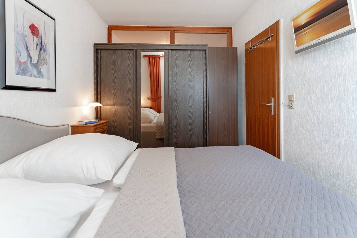 Schlafzimmer 1: 1 Doppelbett (2x 90x200 cm), Kleiderschrank, TV, Verdunkelung: Gardinen & Jalousien, kein Platz für ein Babybett