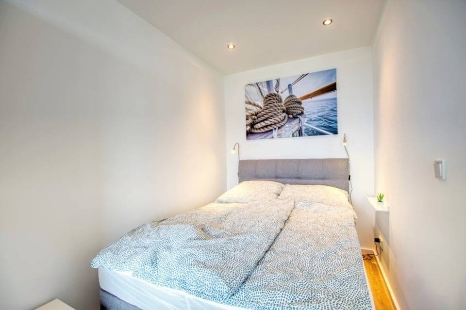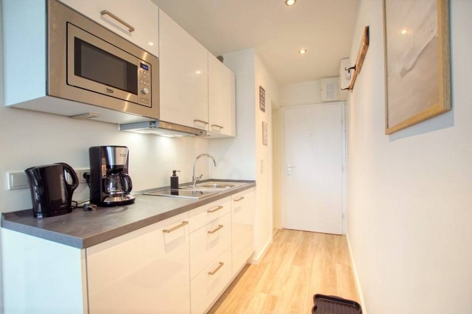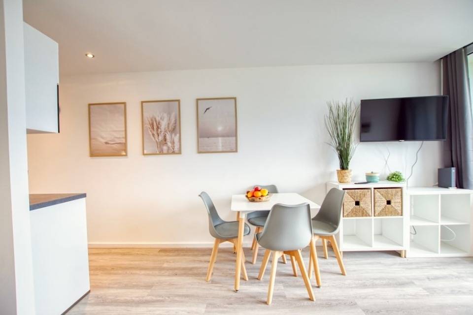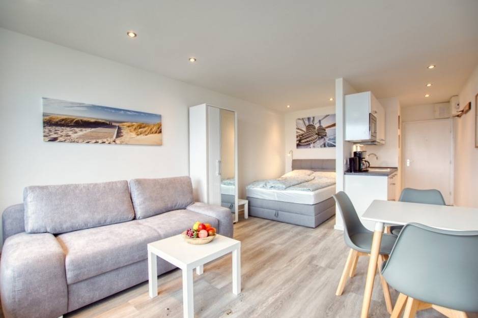 Die 30 m² große Wohnung ist ideal für bis zu 4 Personen und verfügt über einen offenen Schlafbereich mit Doppelbett, Stauraum im Bettkasten und einer umklappbaren Boxspring-Schlafcouch. Zur Ausstattung gehören eine moderne Küche mit Mikrowelle, 2-Plattenherd, Kaffeemaschine und Wasserkocher, ein saniertes Bad mit Duschkabine und Handtuchheizkörper, 42-Zoll-Smart-TV sowie WLAN.