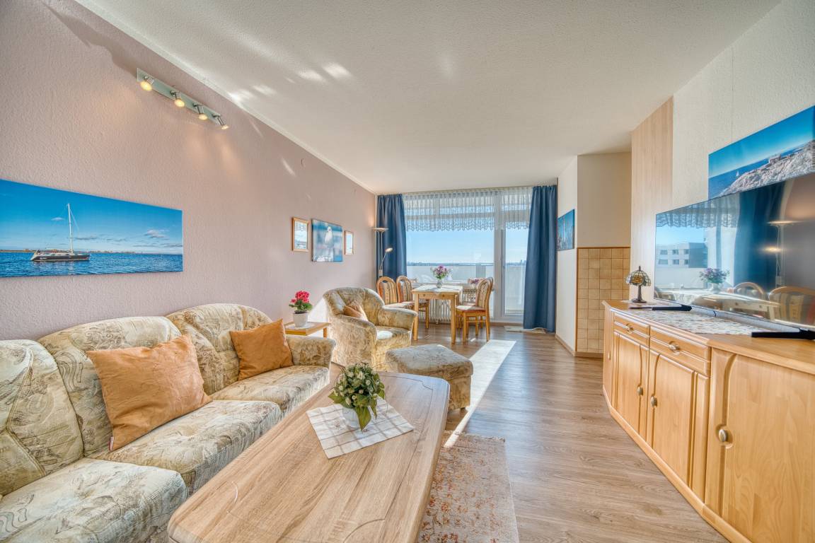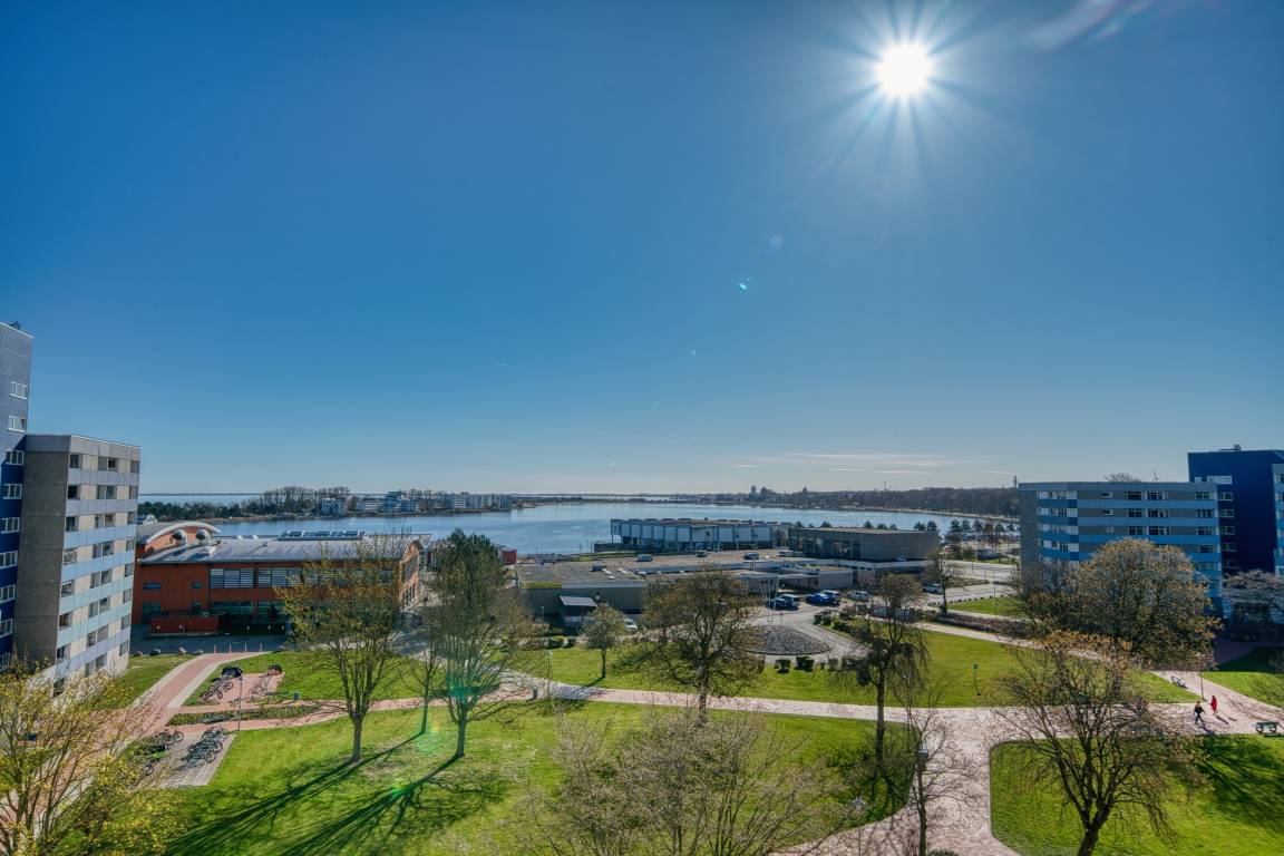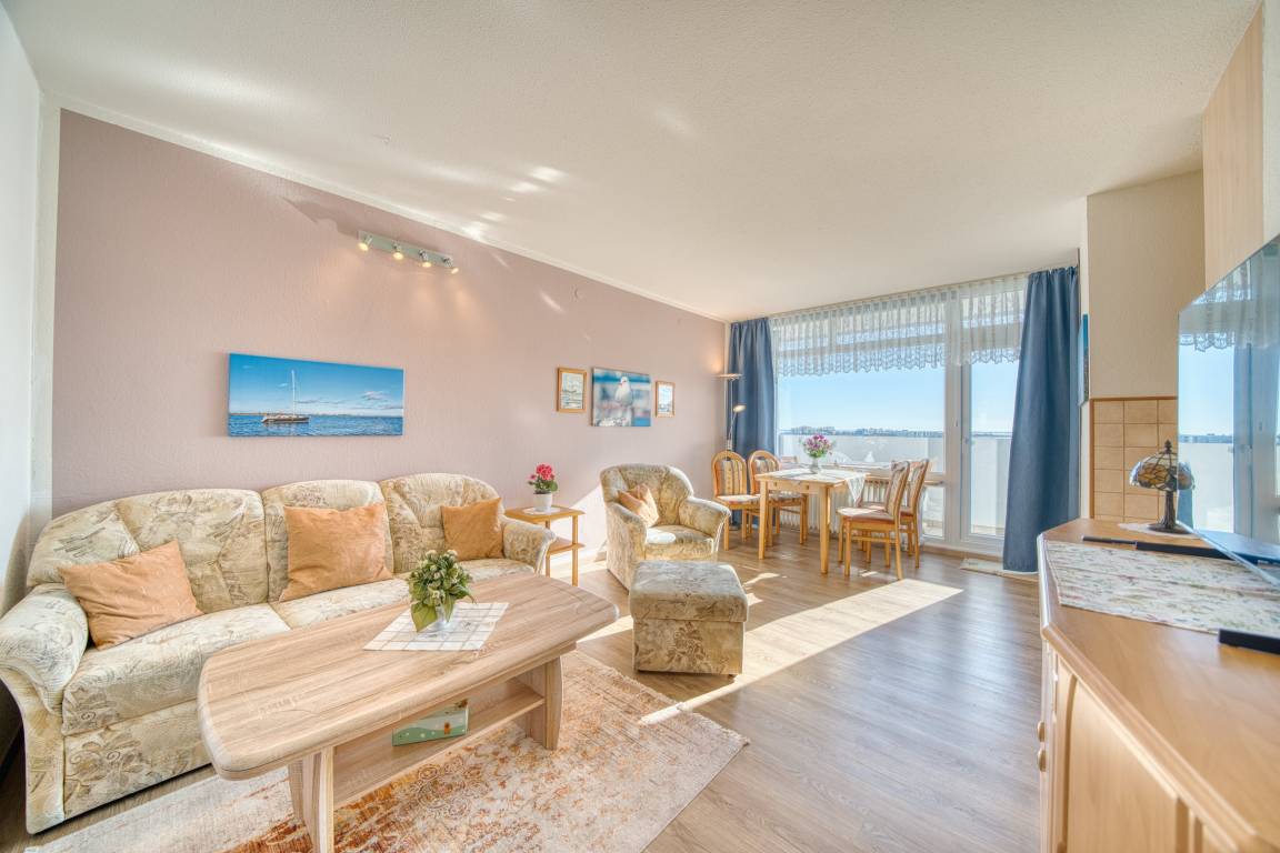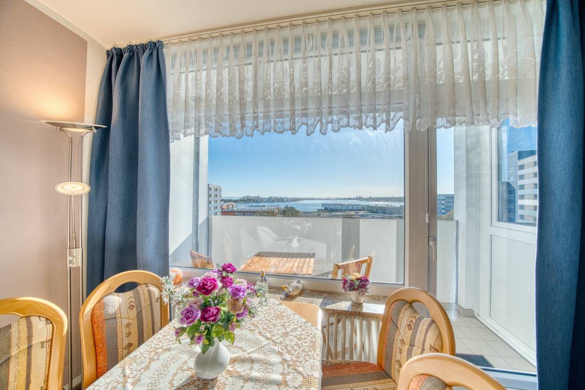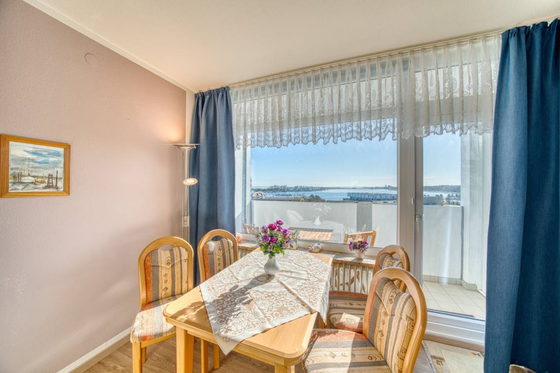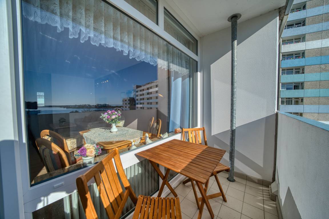 Die Ferienwohnung im Haus F, 6. Etage, mit Balkon zur Ostseite, bietet einen herrlichen Blick auf die Ostsee mit Fehmarnsundbrücke sowie auf den Binnensee mit Stadt- und Yachthafen.