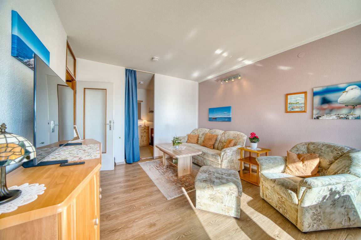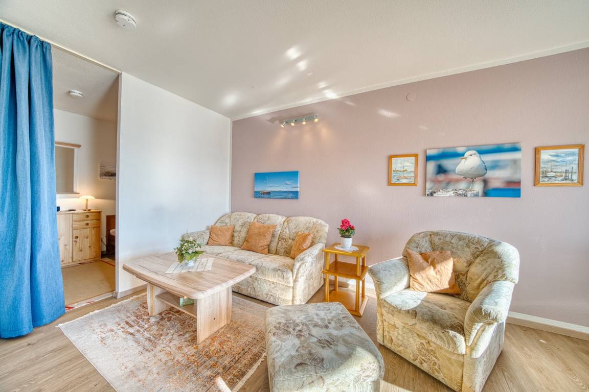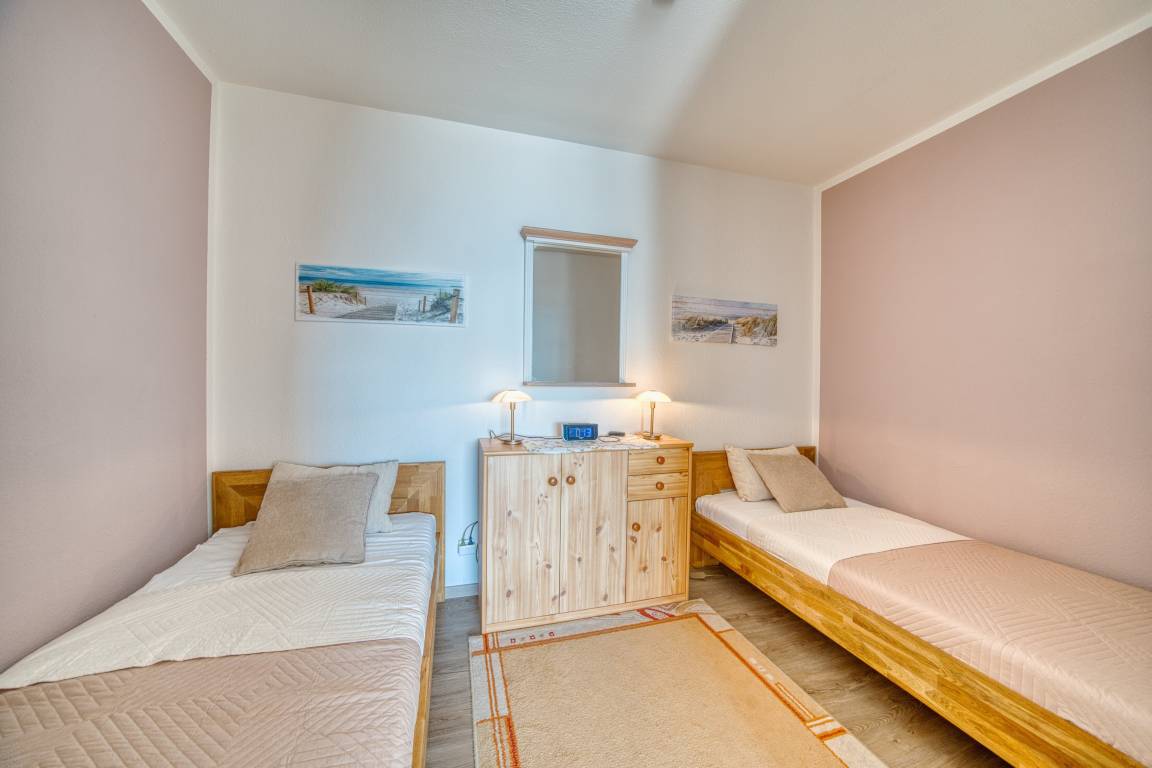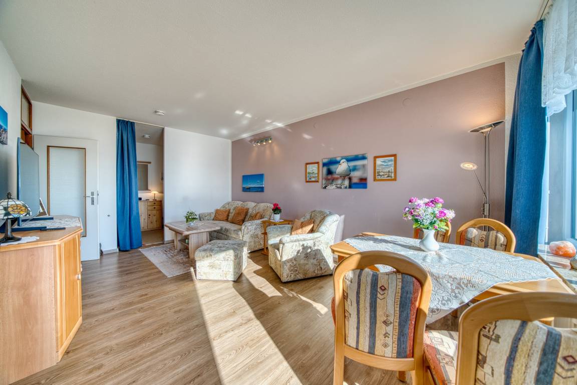 Wohn-/Esszimmer mit Sofa, Flachbild-TV und Radio, Elternschlafraum mit Einzelbetten, separates Kinderzimmer mit Etagenbett. Küche komplett ausgestattet mit Mikrowelle, Kühlschrank mit Gefrierfach und 3-Platten-Herd. Bad mit WC und Duschkabine. Balkon mit herrlicher Aussicht, kostenloses WLAN. Nichtraucherwohnung, keine Haustiere, geeignet für max. 4 Personen. Fahrstuhl und Fahrradräume vorhanden, ca. 300 m zum Strand, kostenfreier Parkplatz hinter dem Ferienpark.