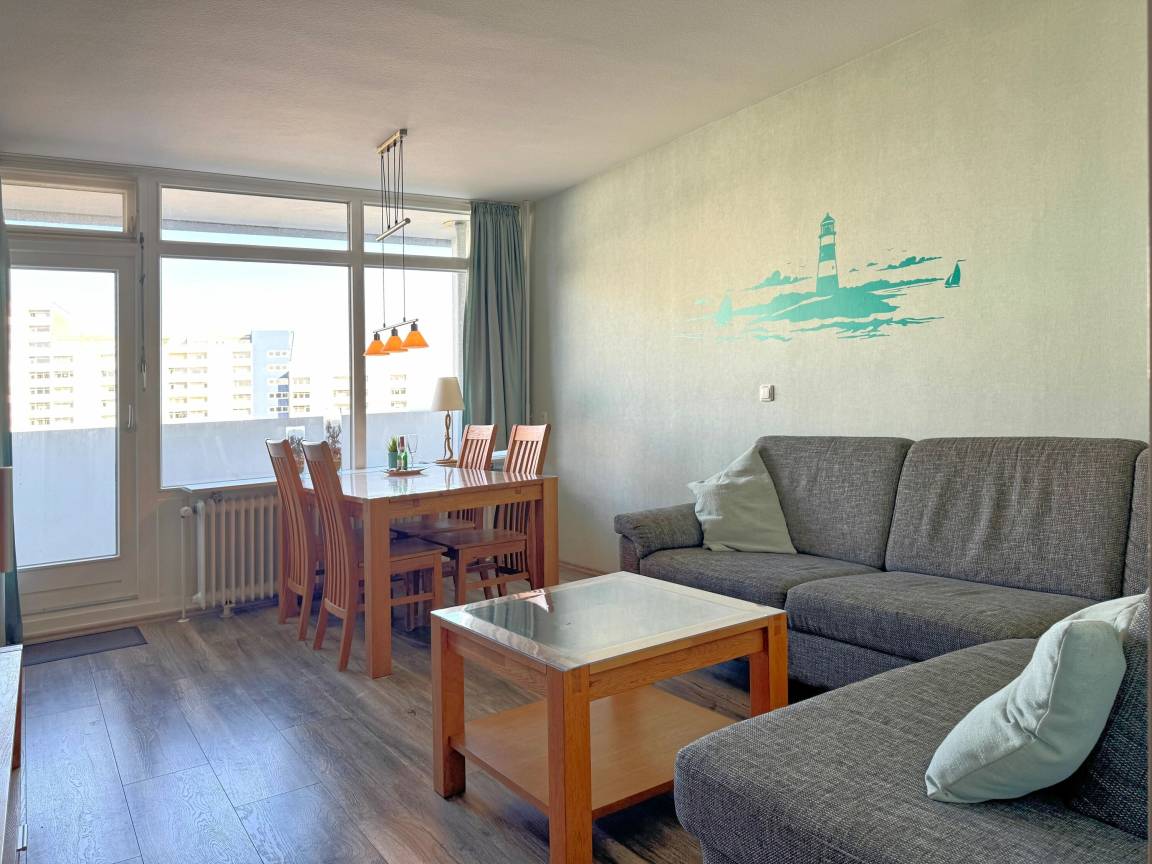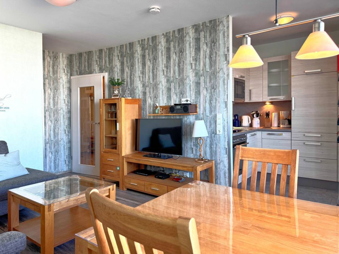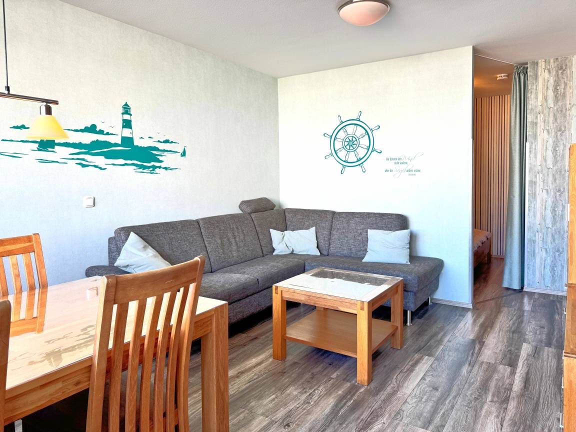 Der Wohnraum ist Ihr zentraler Rückzugsort, ausgestattet mit einer bequemen Couchgarnitur und einem TV, die zum Entspannen und gemeinsamen Spielen einladen. Hier können Sie nach einem aufregenden Tag am Strand oder im Aktiv Hus gemütliche Filme schauen oder einfach die Seele baumeln lassen.