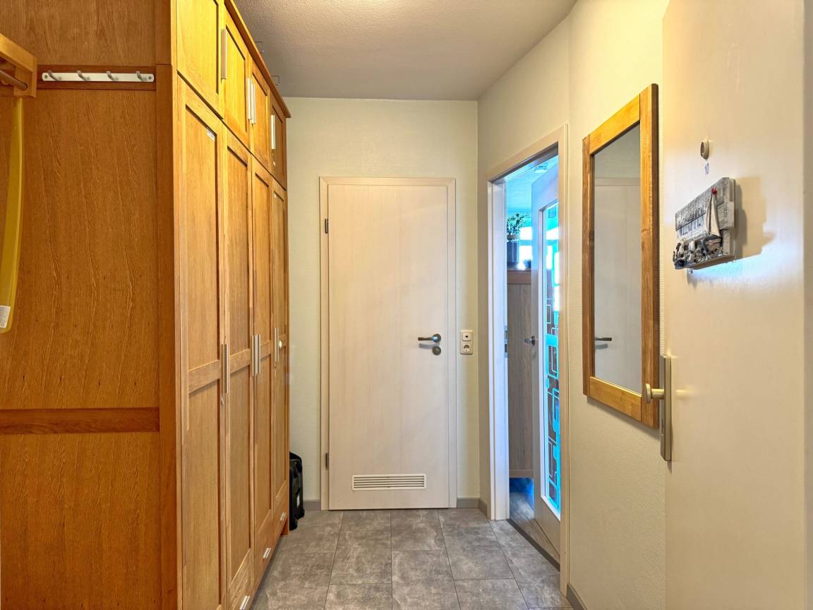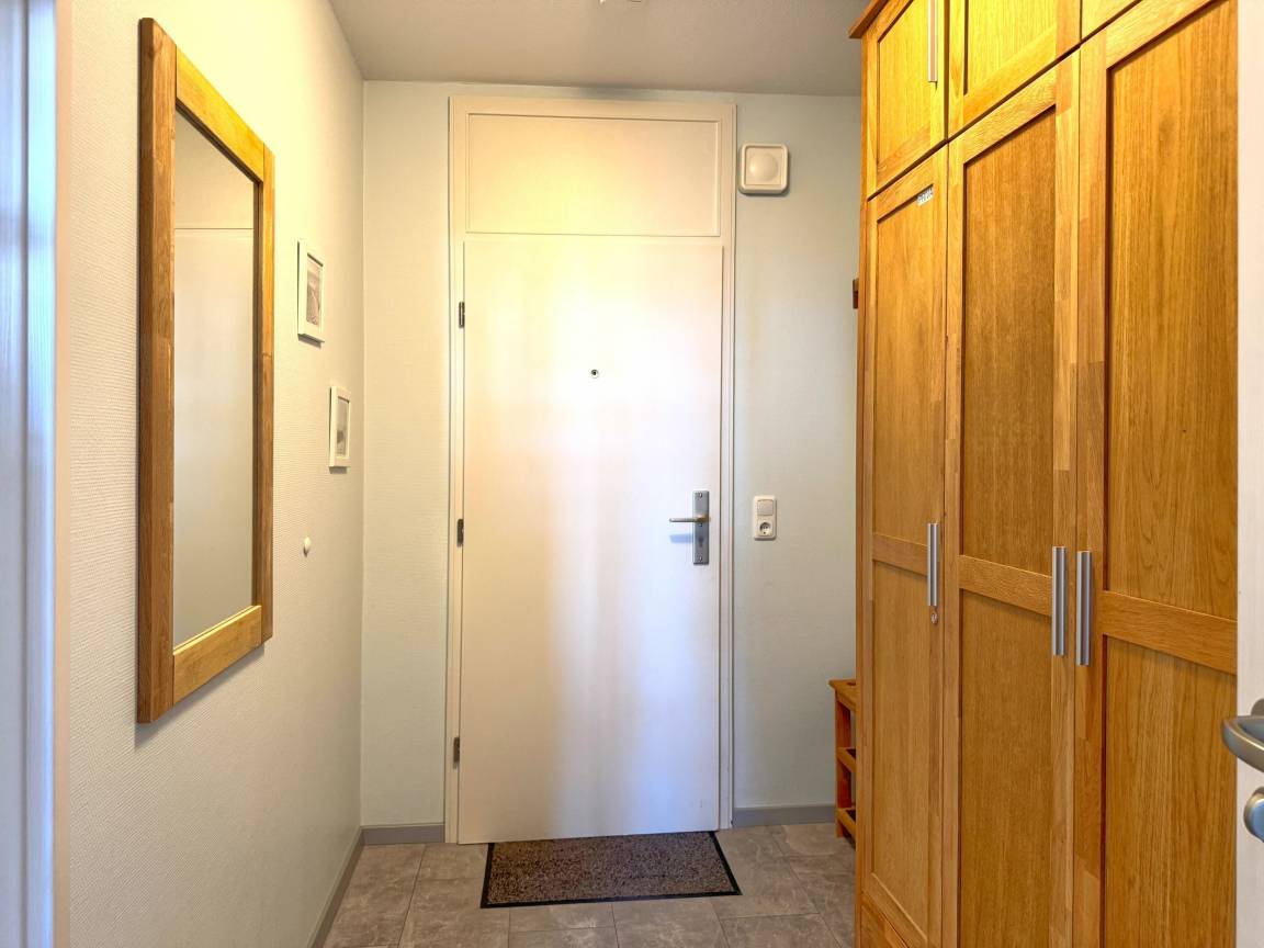 Ein besonderes Highlight der Wohnung ist der Esstisch am Fenster, an dem Sie gemeinsam essen und den Blick nach draußen genießen können. Die große Fensterfront bringt viel Licht ins Innere und schafft eine angenehme, helle Atmosphäre.