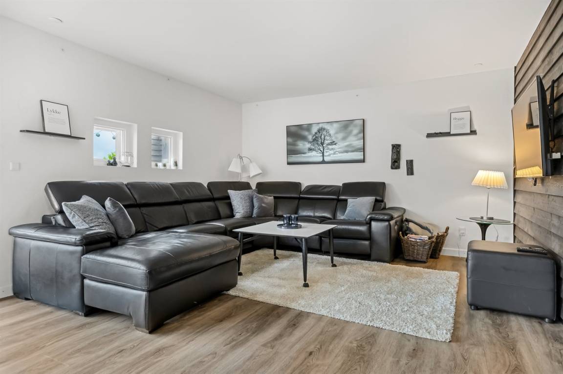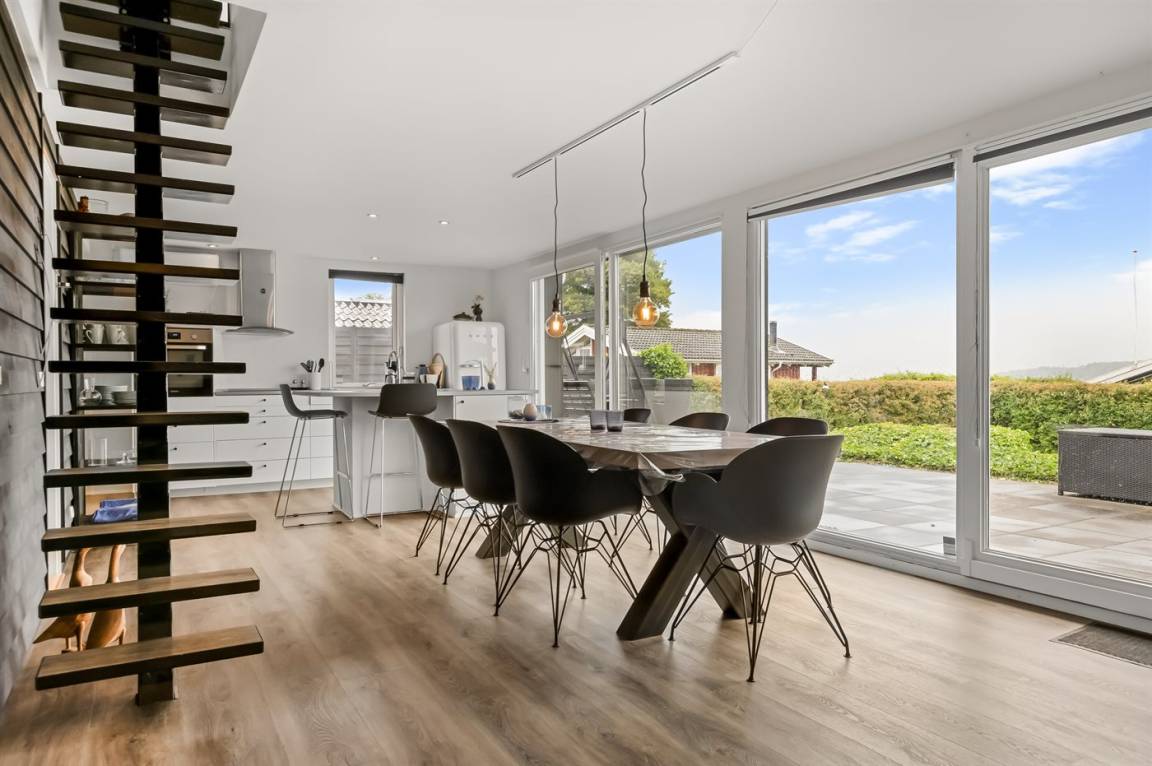 Das Herz des Hauses ist der große und helle Wohn-Küchenbereich, in dem breite Fensterfronten viel Licht hereinlassen und ein offenes Raumgefühl schaffen. Durch die großen Schiebetüren gelangst du direkt auf die Terrasse – das vermittelt ein wunderbares Gefühl, dass Innen- und Außenbereich miteinander verschmelzen.