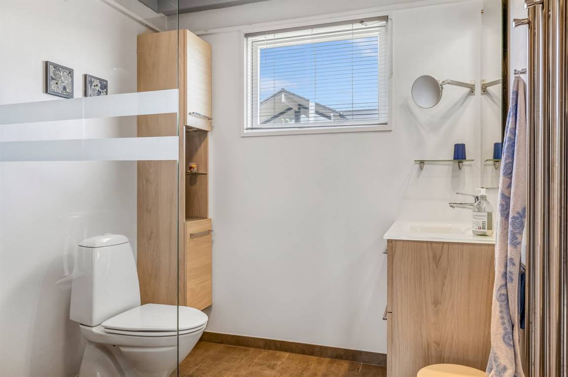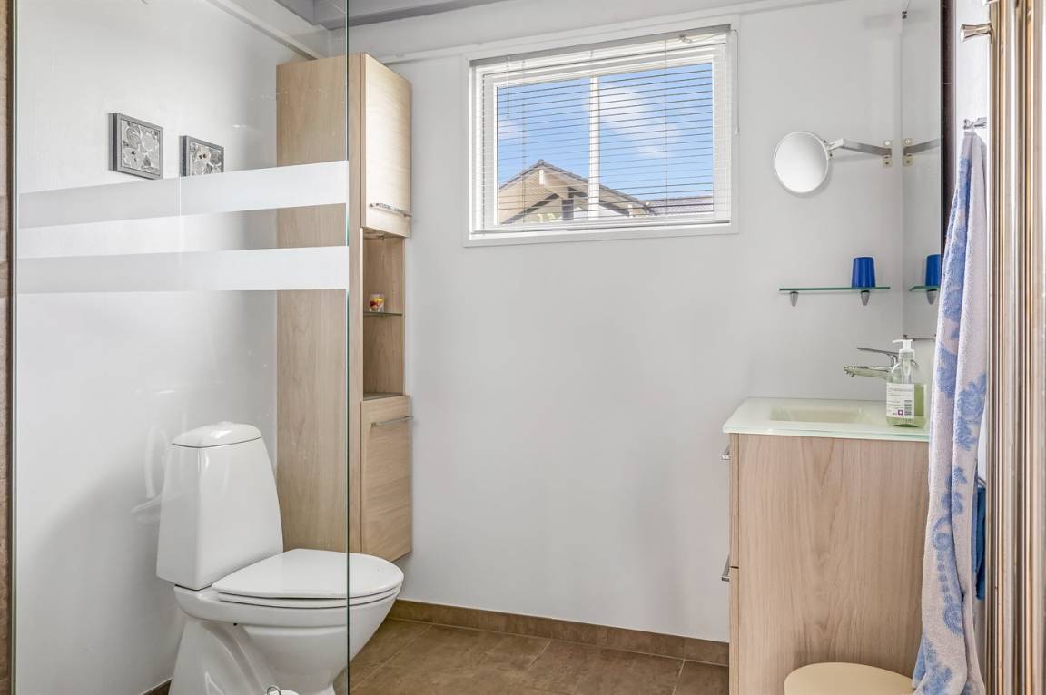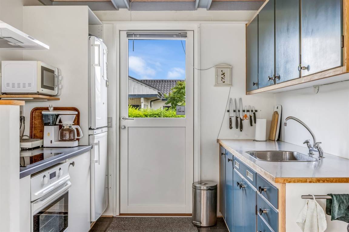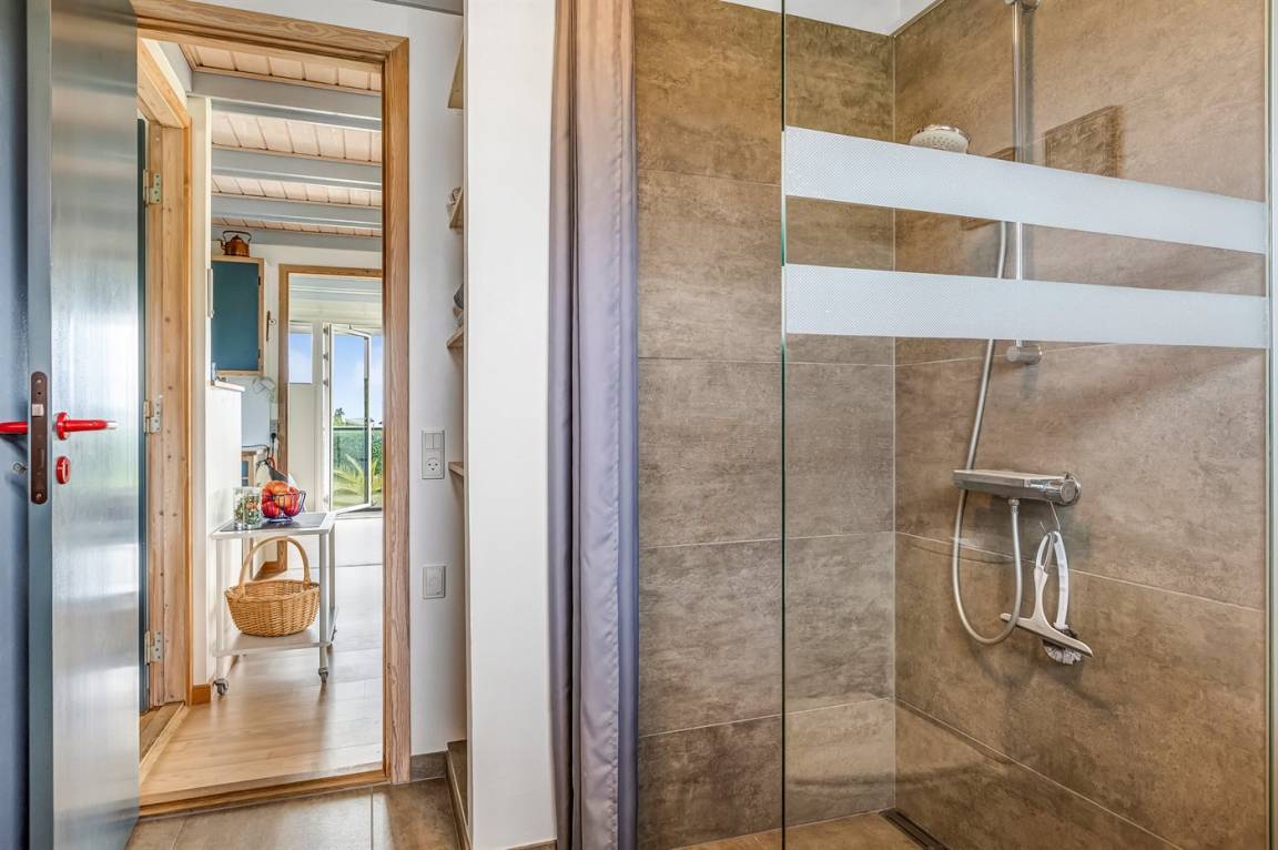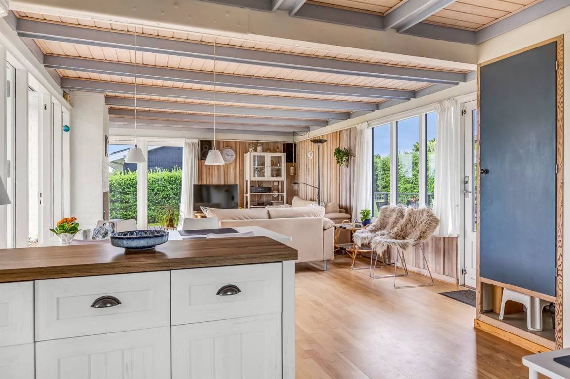 Der natürliche Treffpunkt des Hauses ist der helle und einladende Wohn- und Essbereich mit Küche, Esstisch und gemütlicher Sofaecke – perfekt für gemeinsame Mahlzeiten, zum Entspannen oder einfach zum gemütlichen Beisammensein. Es gibt außerdem ein modernes Badezimmer und zwei schöne Schlafzimmer, von denen eines direkten Zugang zur Terrasse und zum Garten hat.
