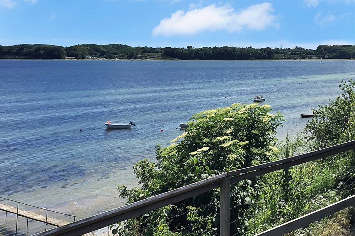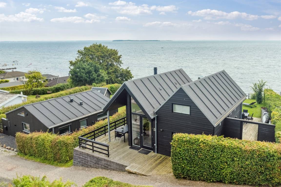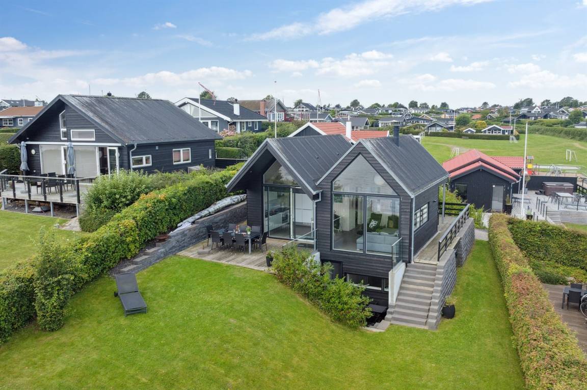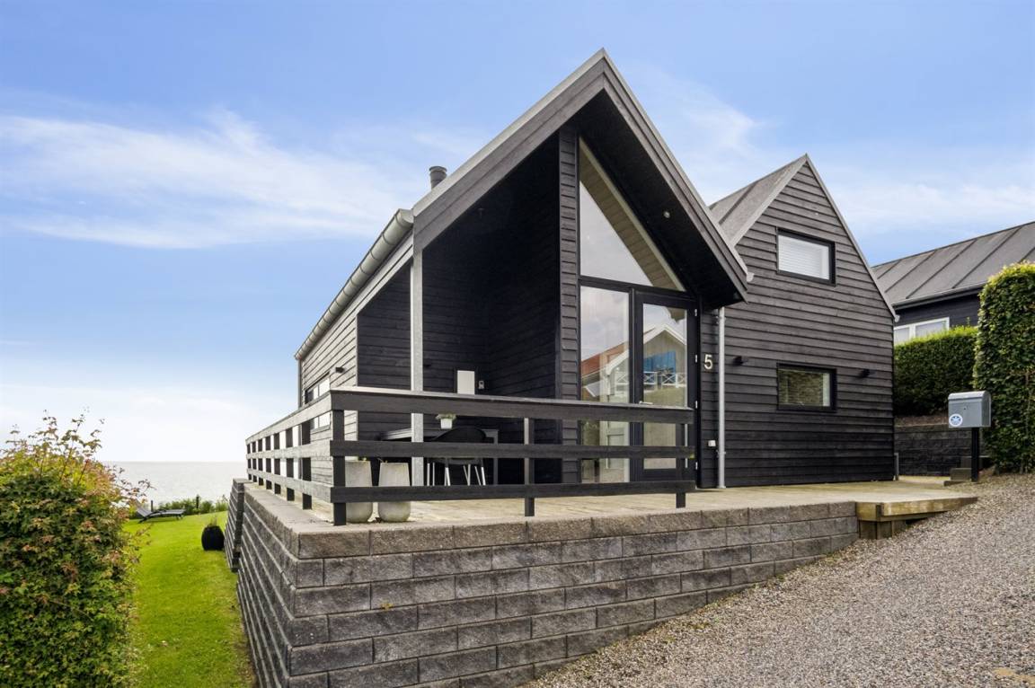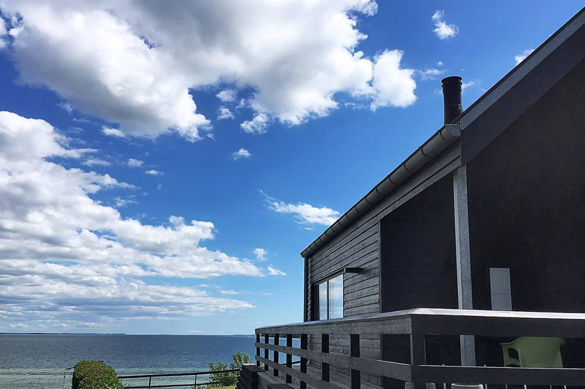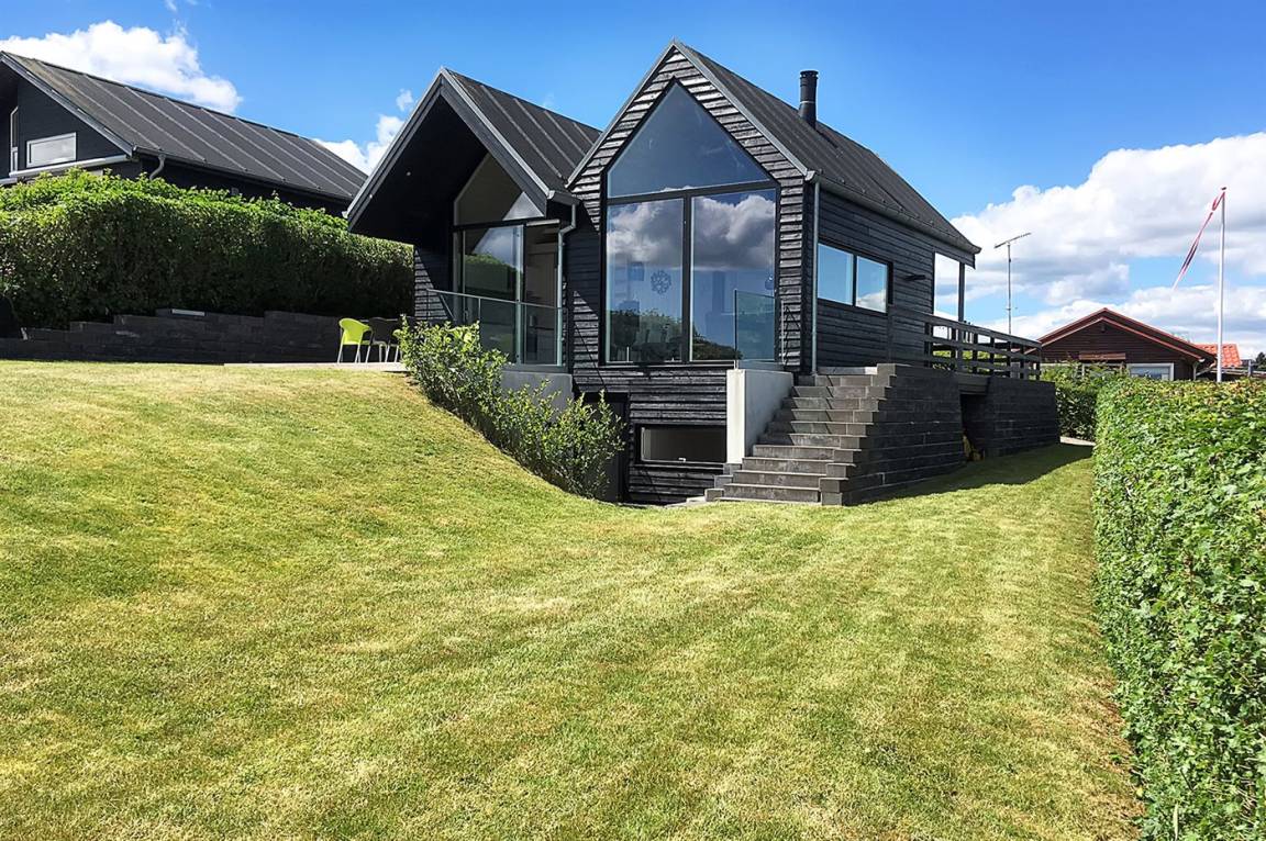 Ein schönes Ferienhaus aus Holz, 2011 gebaut, auf einem Naturgrundstück in erster Reihe zum Strand hinunter gelegen und mit Panoramaaussicht auf den Kleinen Belt. Zum Haus gehören Terrassen mit Gartenmöbeln.