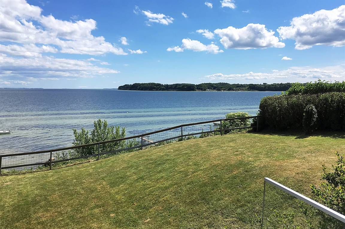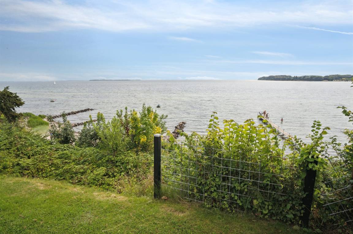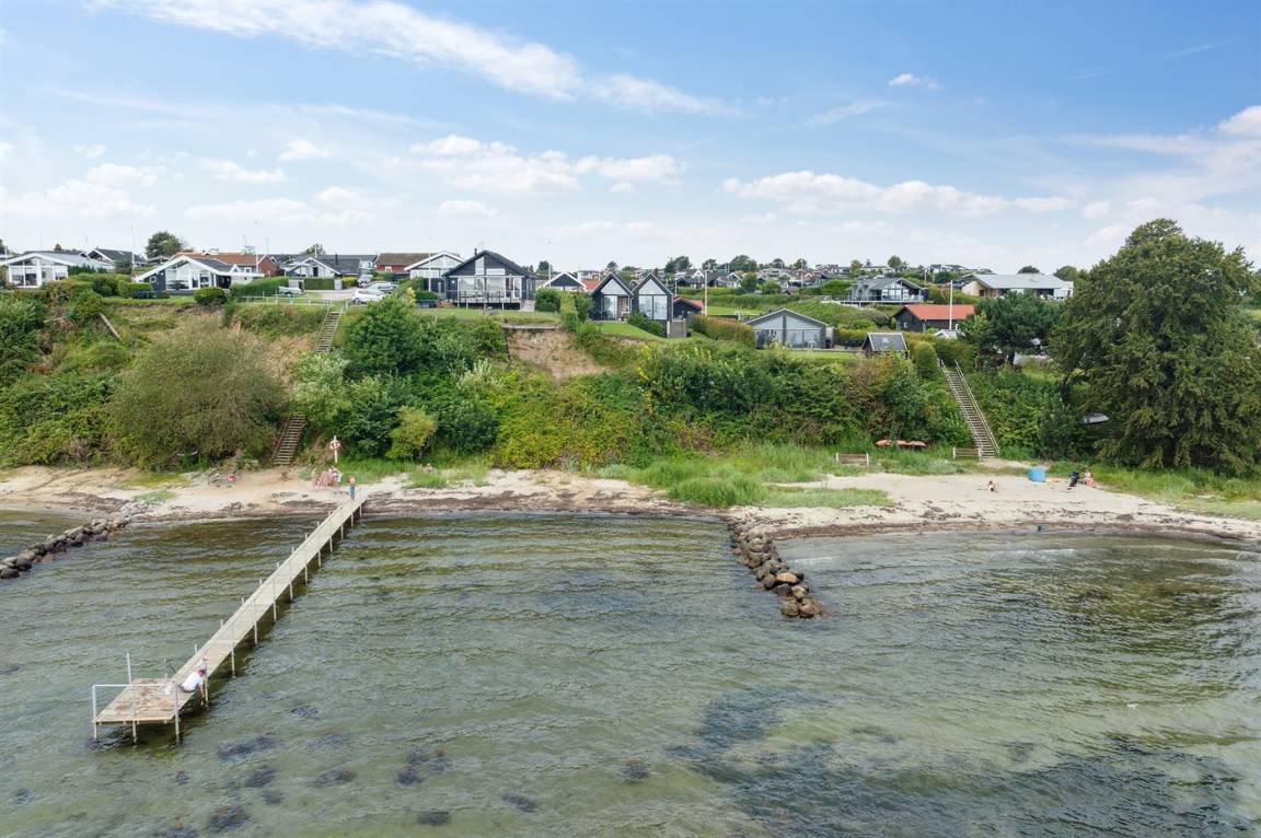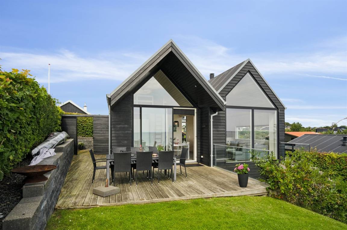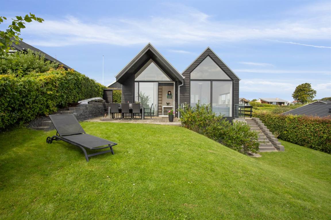 Ein schönes Ferienhaus aus Holz, 2011 gebaut, auf einem Naturgrundstück in erster Reihe zum Strand hinunter gelegen und mit Panoramaaussicht auf den Kleinen Belt. Zum Haus gehören Terrassen mit Gartenmöbeln.