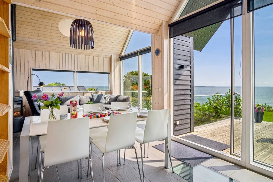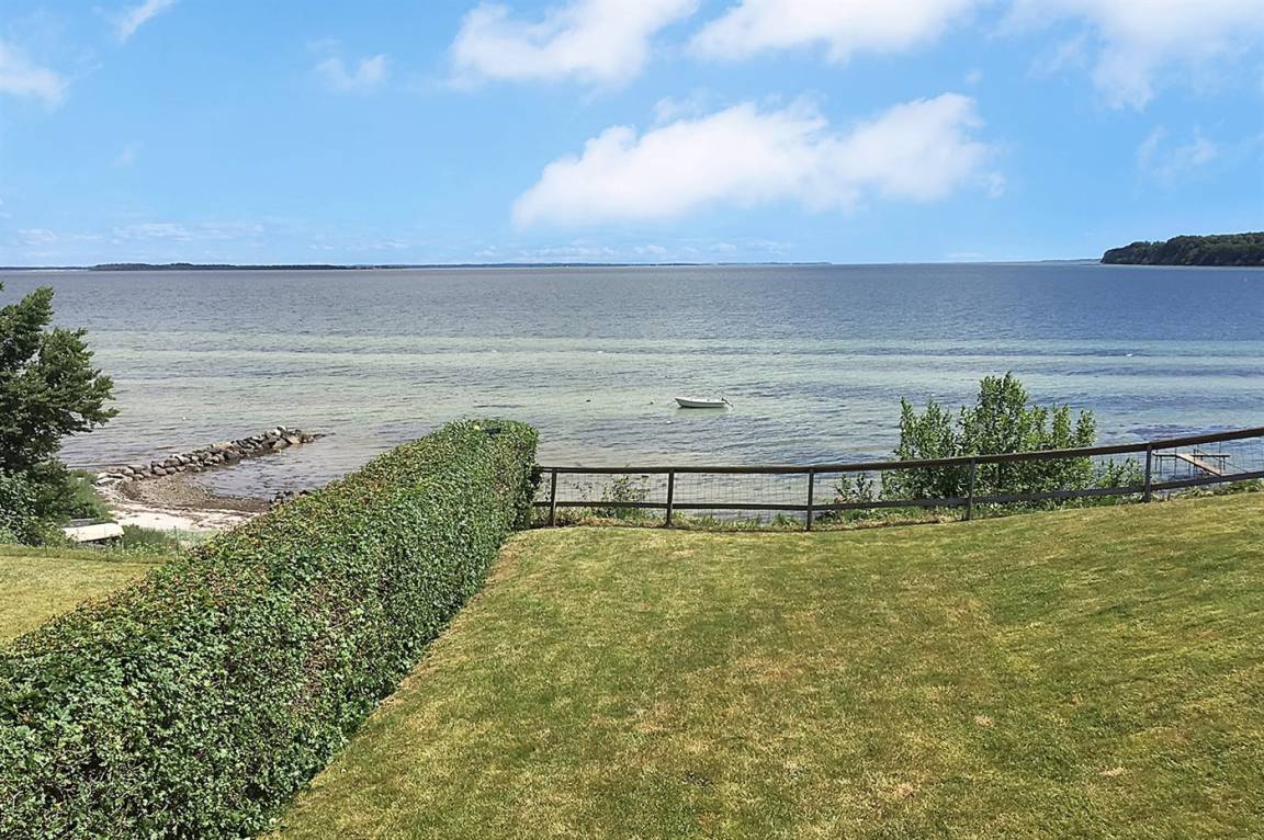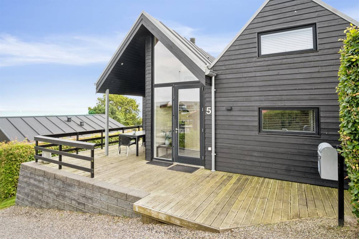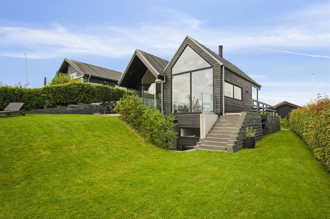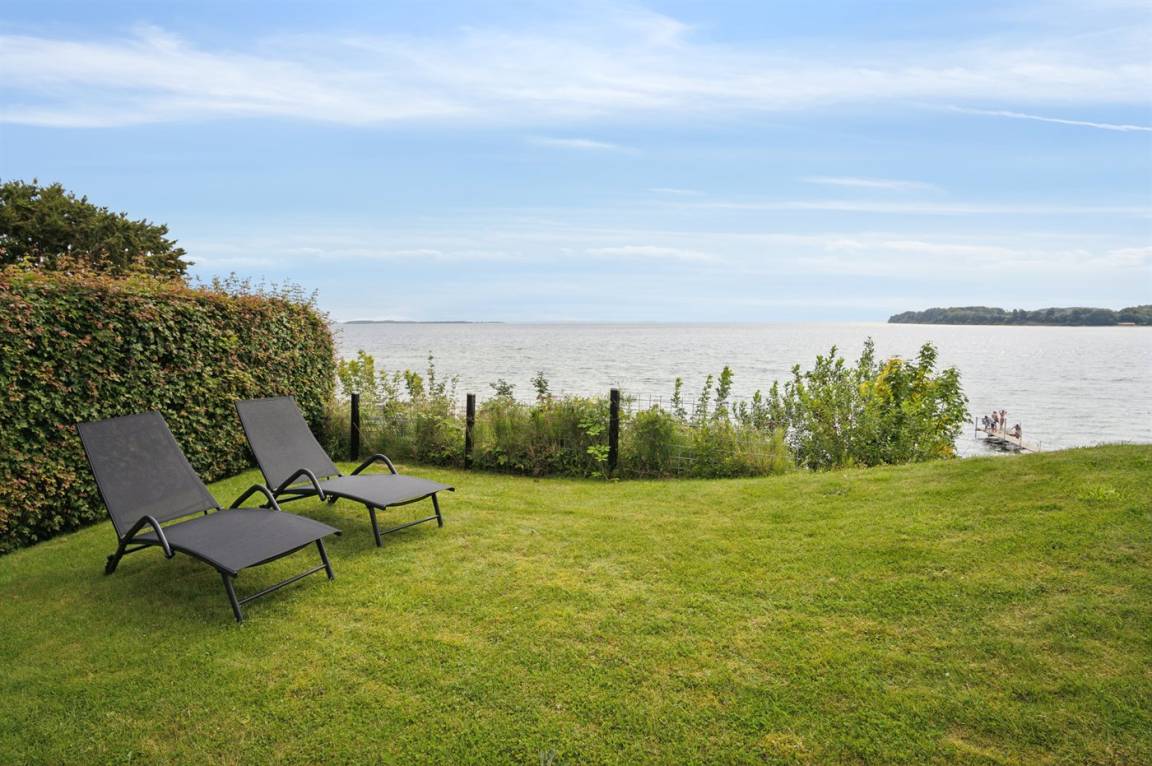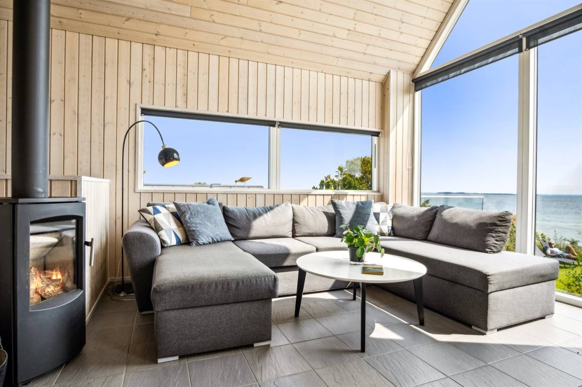 Ein schönes Ferienhaus aus Holz, 2011 gebaut, auf einem Naturgrundstück in erster Reihe zum Strand hinunter gelegen und mit Panoramaaussicht auf den Kleinen Belt. Zum Haus gehören Terrassen mit Gartenmöbeln.