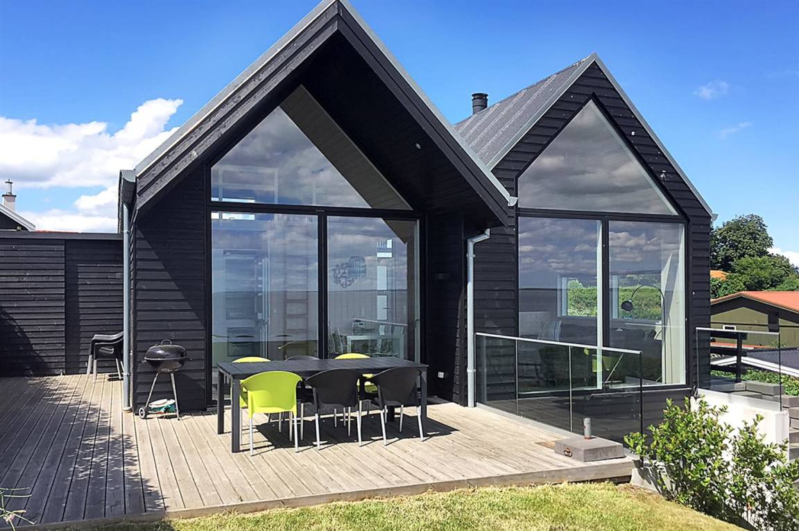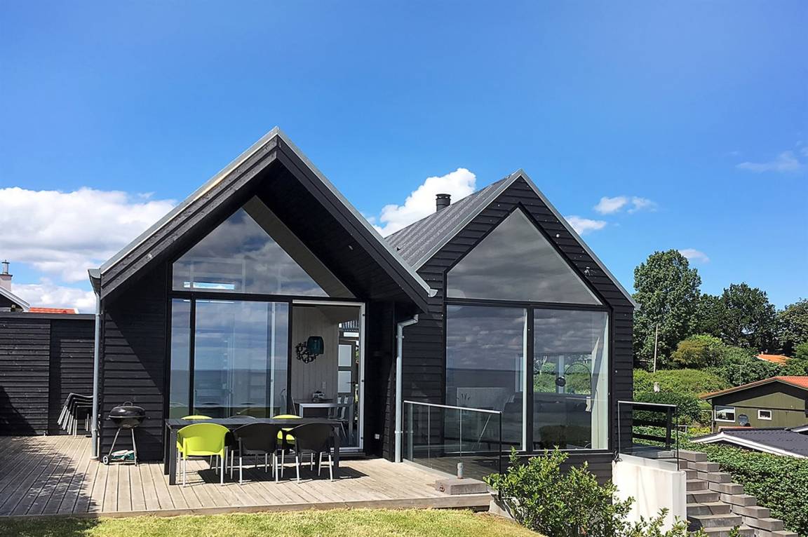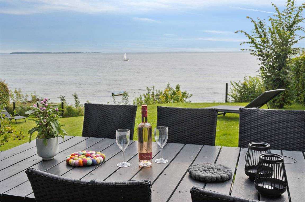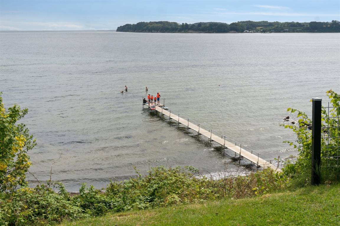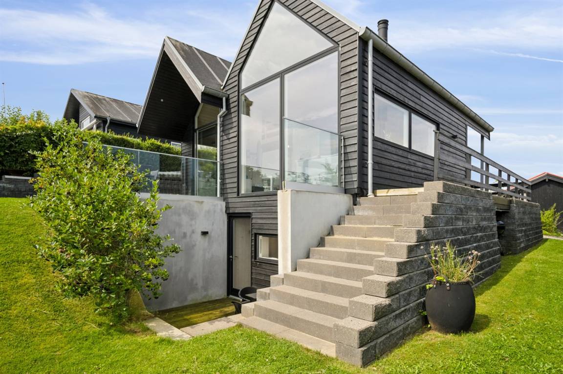 Ein schönes Ferienhaus aus Holz, 2011 gebaut, auf einem Naturgrundstück in erster Reihe zum Strand hinunter gelegen und mit Panoramaaussicht auf den Kleinen Belt. Zum Haus gehören Terrassen mit Gartenmöbeln.