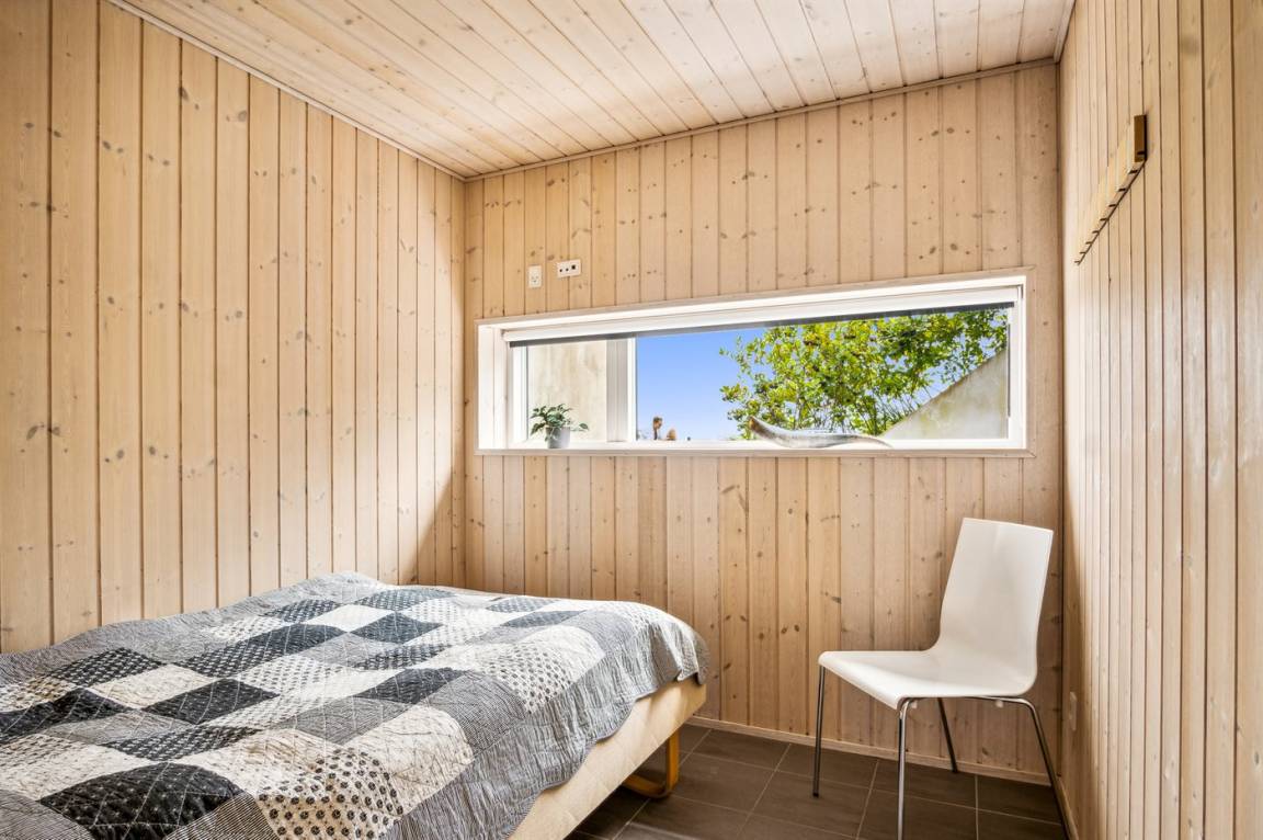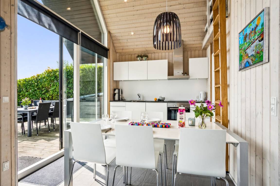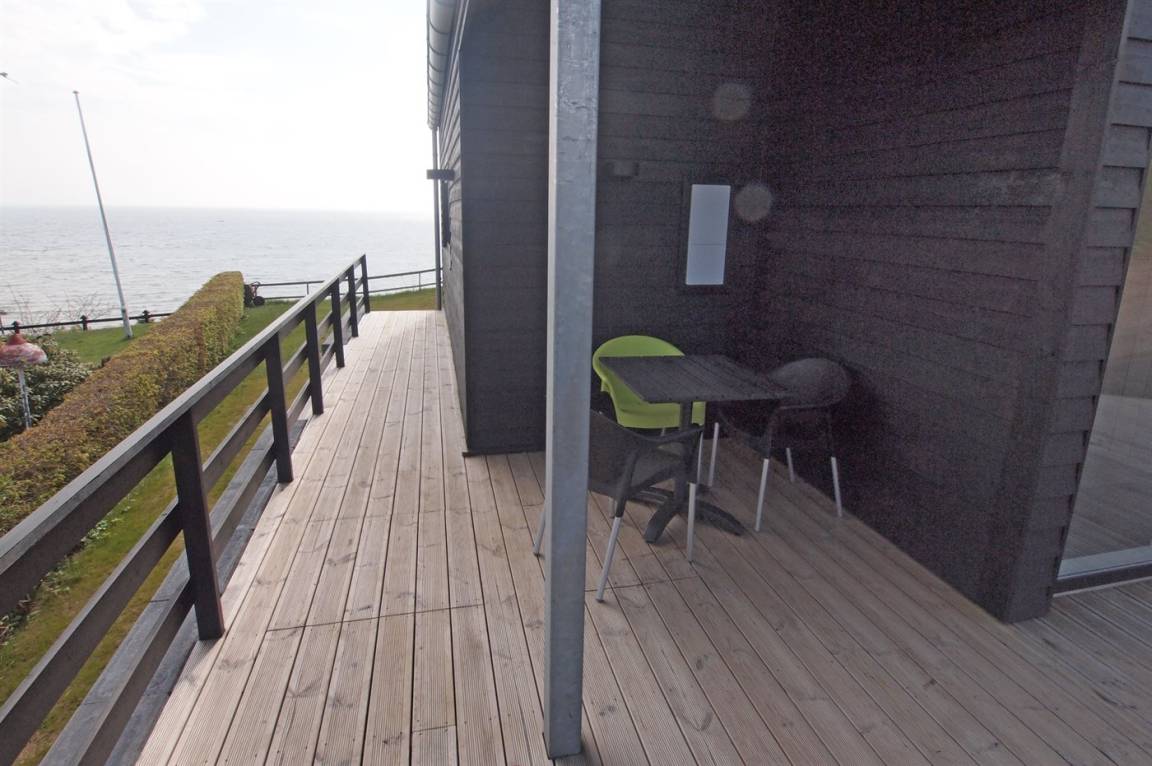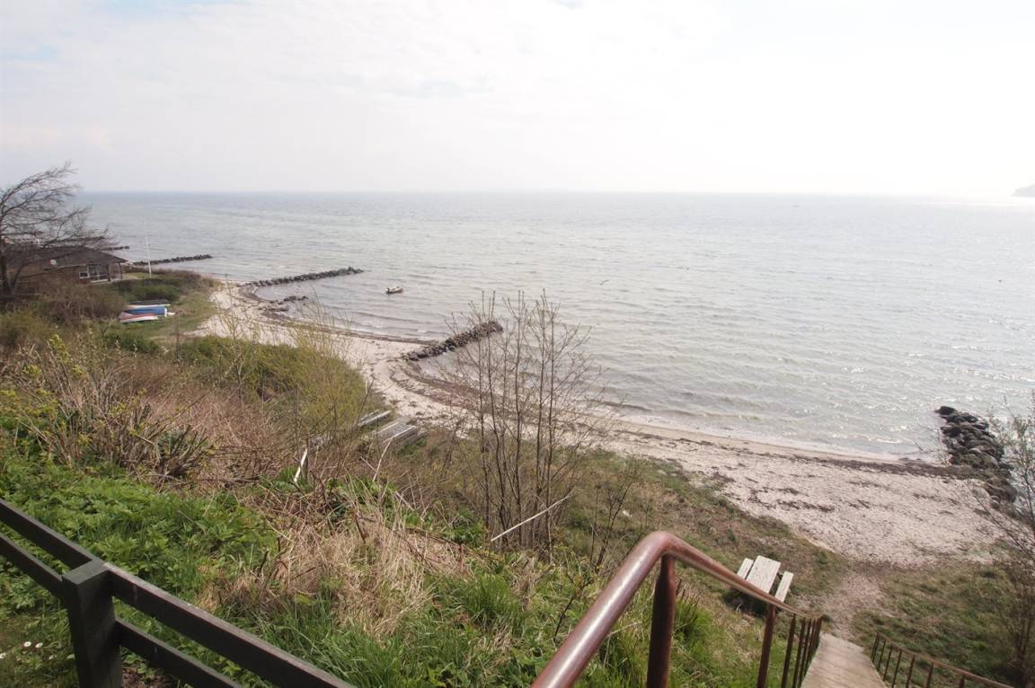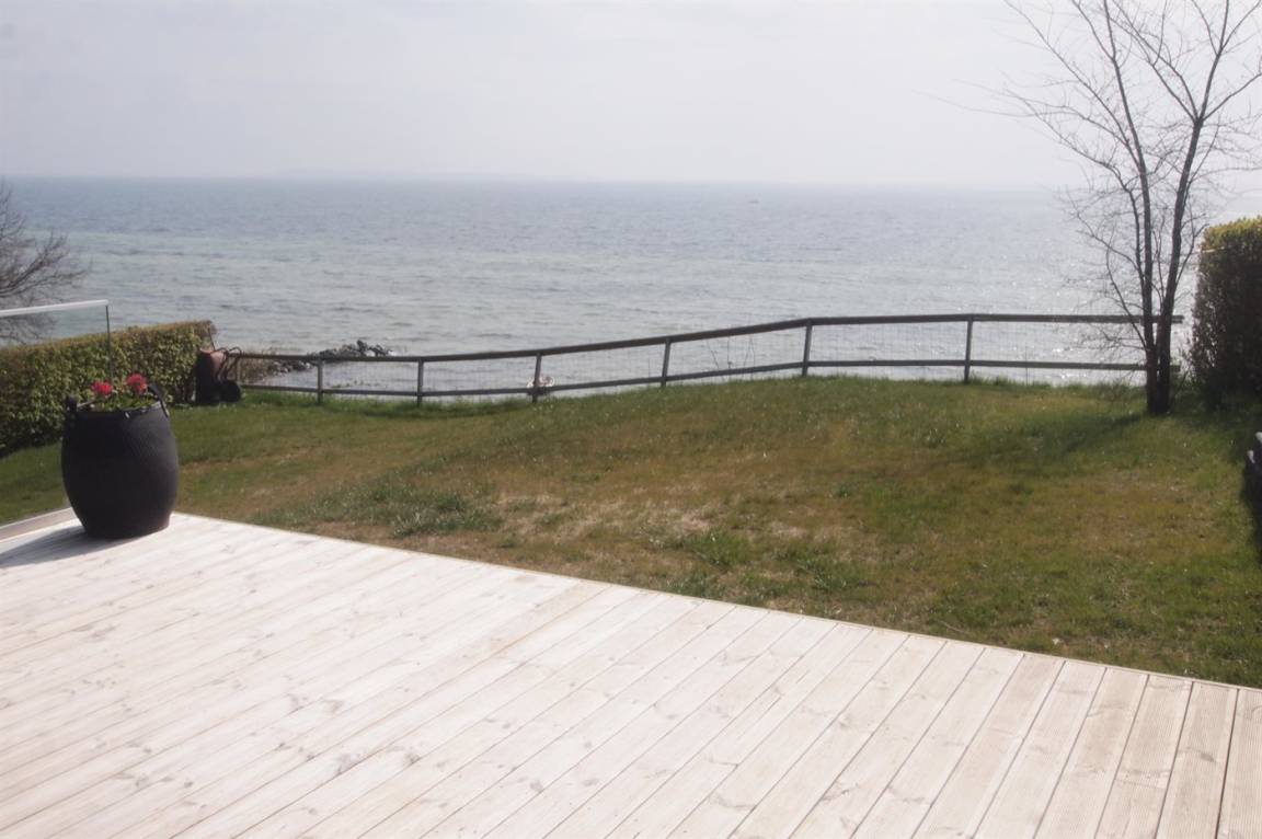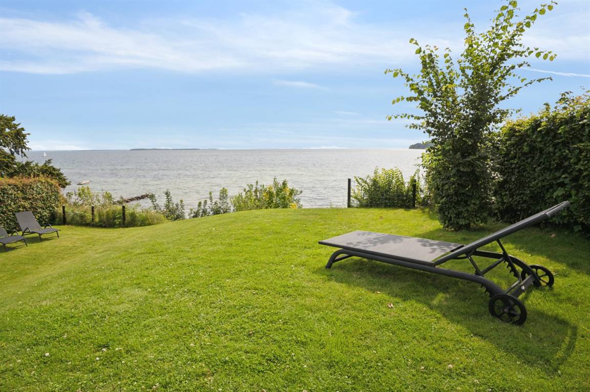 Ein schönes Ferienhaus aus Holz, 2011 gebaut, auf einem Naturgrundstück in erster Reihe zum Strand hinunter gelegen und mit Panoramaaussicht auf den Kleinen Belt. Zum Haus gehören Terrassen mit Gartenmöbeln.