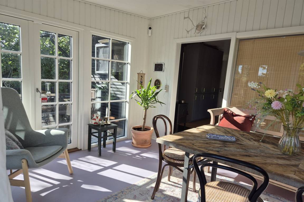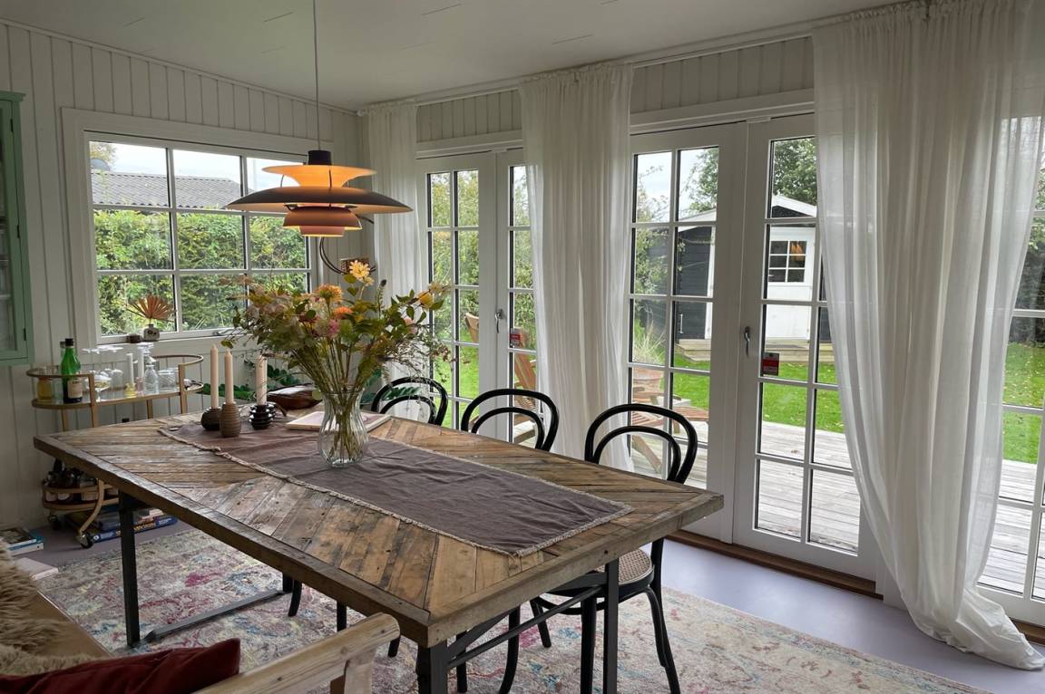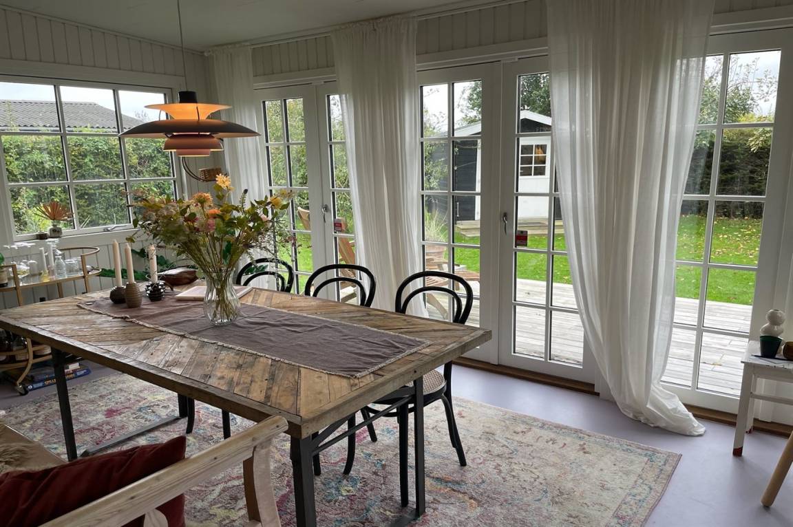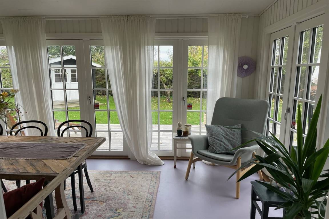 Der Wintergarten hat Sprossenfenster, bodenlange Vorhänge und eine stimmungsvolle Einrichtung, die dich das ganze Jahr über zur Entspannung einlädt.