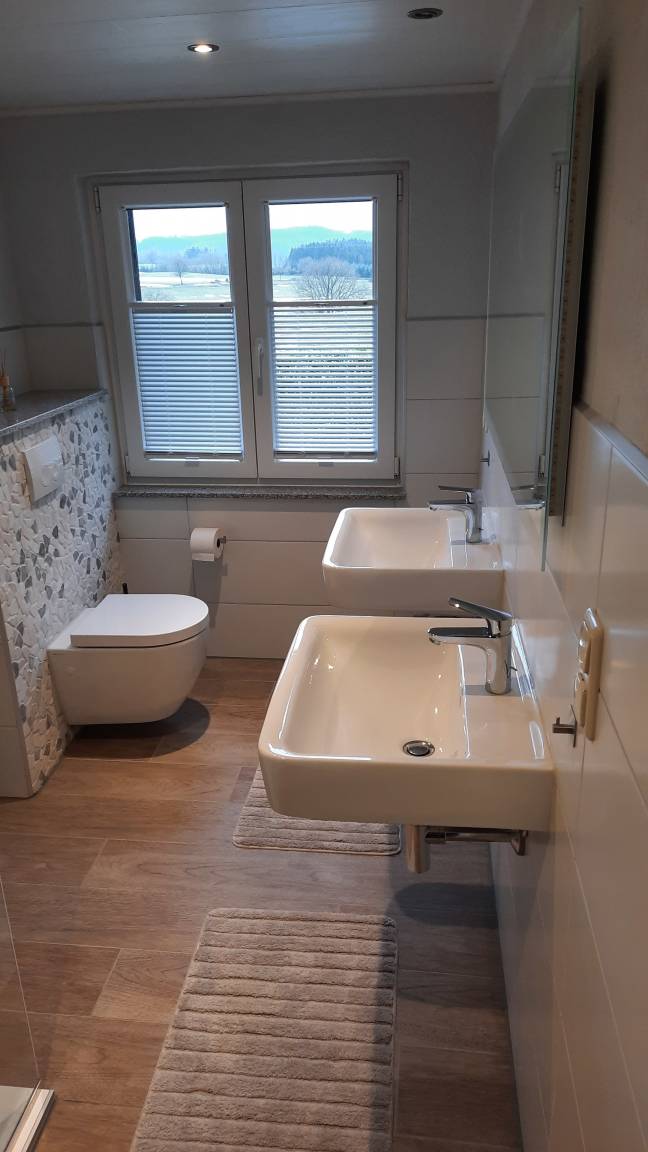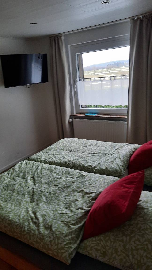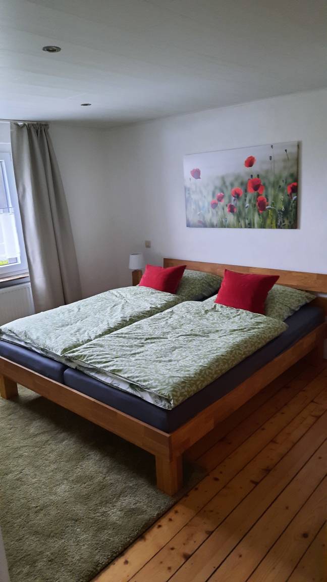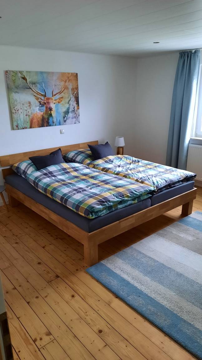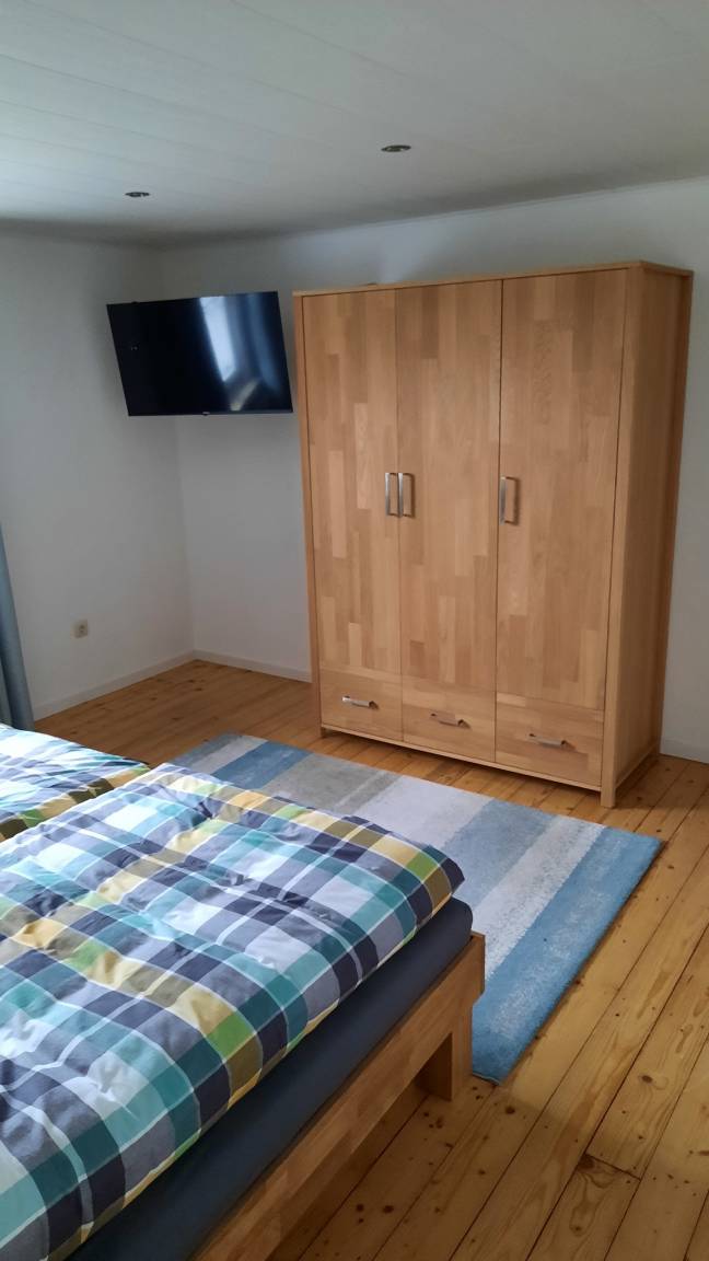 Das Obergeschoss verfügt über 3 Schlafzimmer (zwei Schlafzimmer mit Doppelbetten und Fernseher, 1 Schlafzimmer mit 2 Einzelbetten) und ein Badezimmer mit Dusche und WC (Fön vorhanden). Alle Schlafzimmer sind mit Verdunkelungsvorhängen ausgestattet.