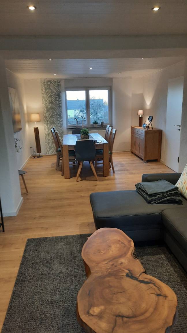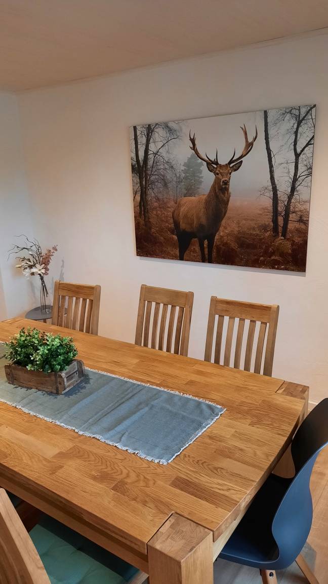 Das Wohn- /Esszimmer verfügt über eine große Couch, einen Fernseher, einen Bluetooth-Lautsprecher und einen großen Esstisch. Hier können gemütliche Abende in geselliger Runde verbracht werden.