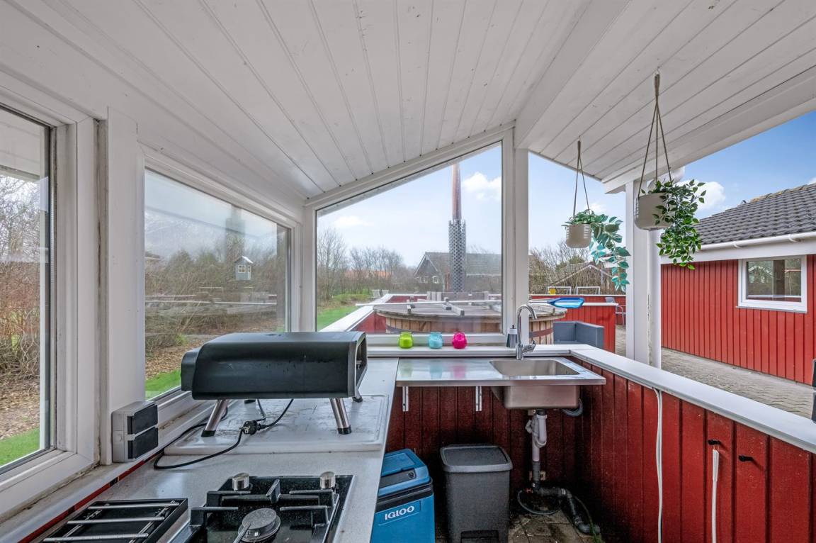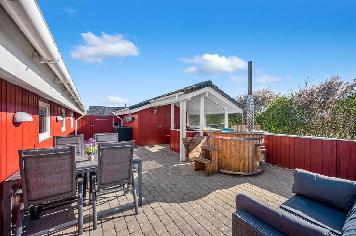 Durch die Fensterfront im Wohnbereich gelangst du direkt auf die große, eingezäunte und teilweise überdachte Terrasse. Die Terrasse ist ideal für Kinder und Hunde, da sie komplett eingezäunt ist. Sie ist in verschiedene gemütliche Bereiche unterteilt – zum Beispiel mit einer Lounge-Ecke und einem Essbereich. Wenn du das Leben im Freien liebst, wirst du auch das überdachte Außenküchen-Modul zu schätzen wissen. Und wenn du dir etwas ganz Besonderes gönnen möchtest, heize das Badefass ein. Eingetaucht in das warme Wasser kannst du wunderbar abschalten, und am Abend hast du freien Blick auf den klaren Sternenhimmel – ein unvergessliches Erlebnis im Sommer wie im Winter.