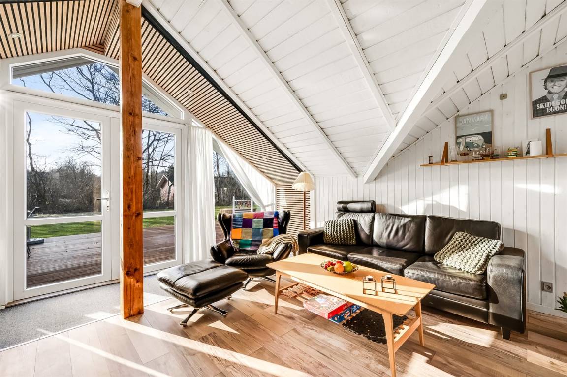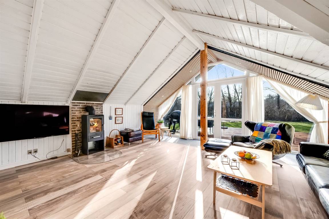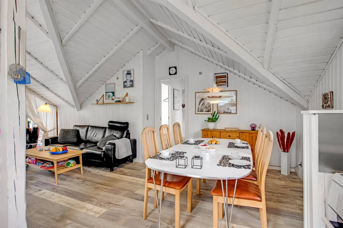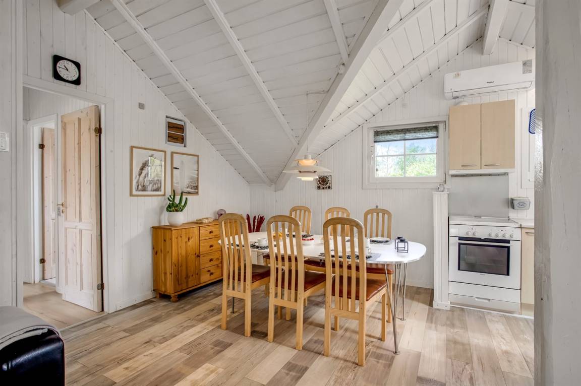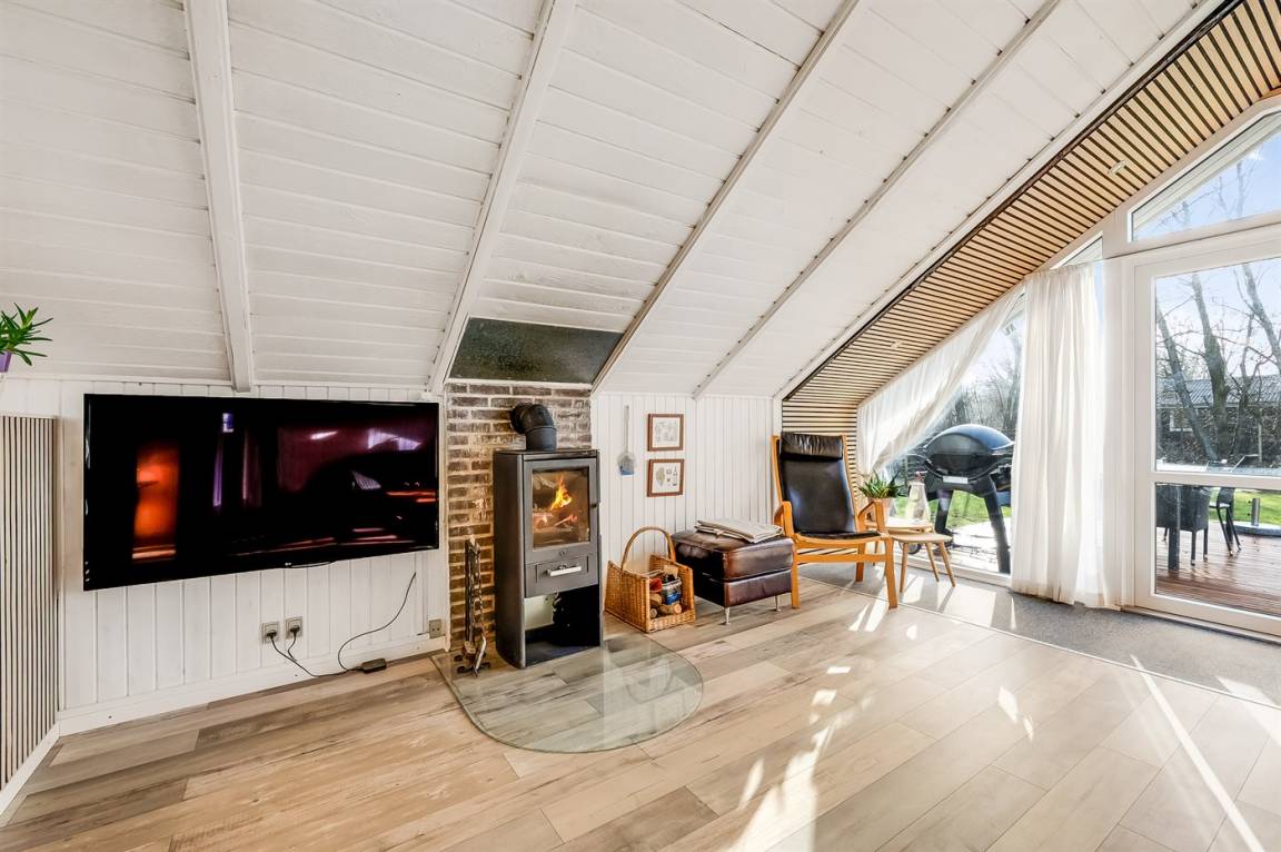 Das Innere des Ferienhauses ist hell und freundlich, und wenn Sie das Wohnzimmer betreten, werden Sie sofort die schöne Decke bemerken, die ein Gefühl von Räumlichkeit, Gemütlichkeit und Charme verleiht. Die große Couch lädt zum Faulenzen ein und der Kaminofen sorgt für ein gemütlichs Ambiente und ist perfekt für kühle Abende.