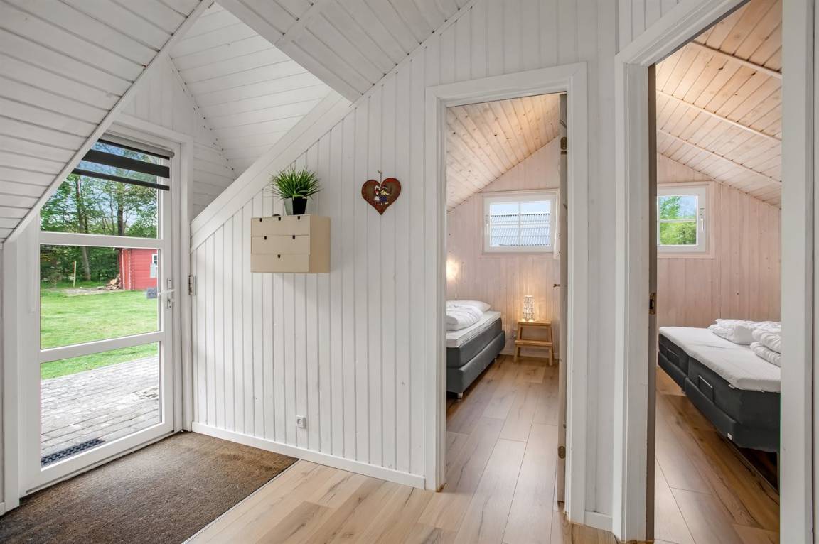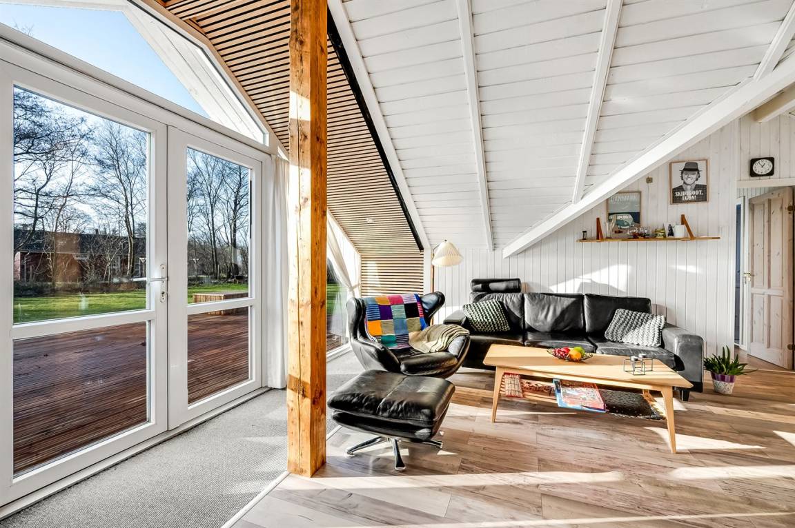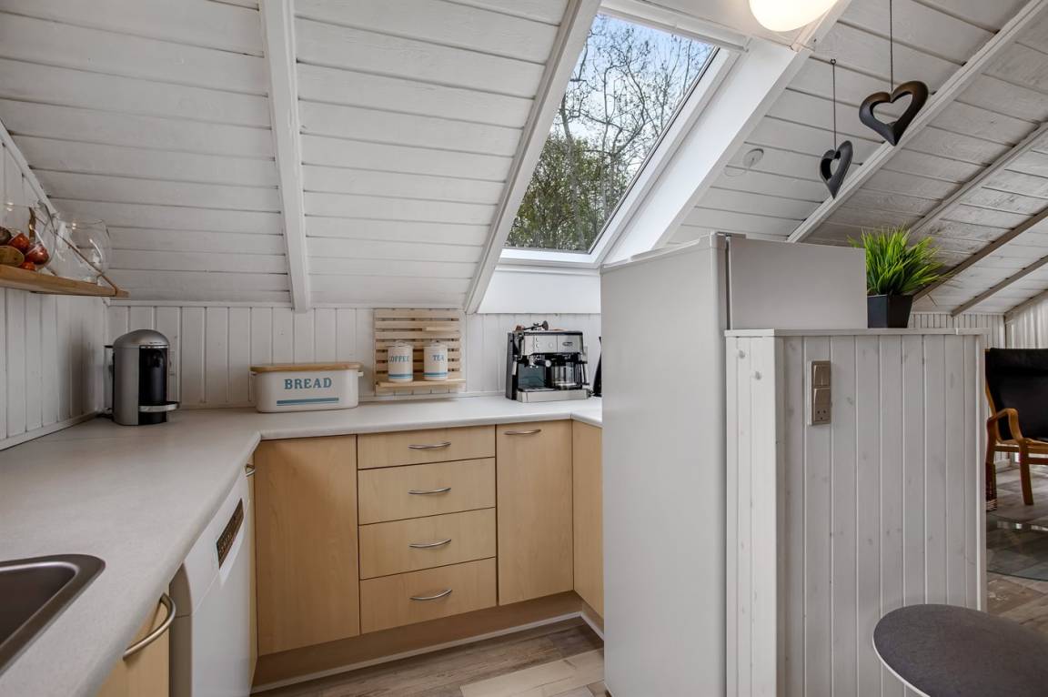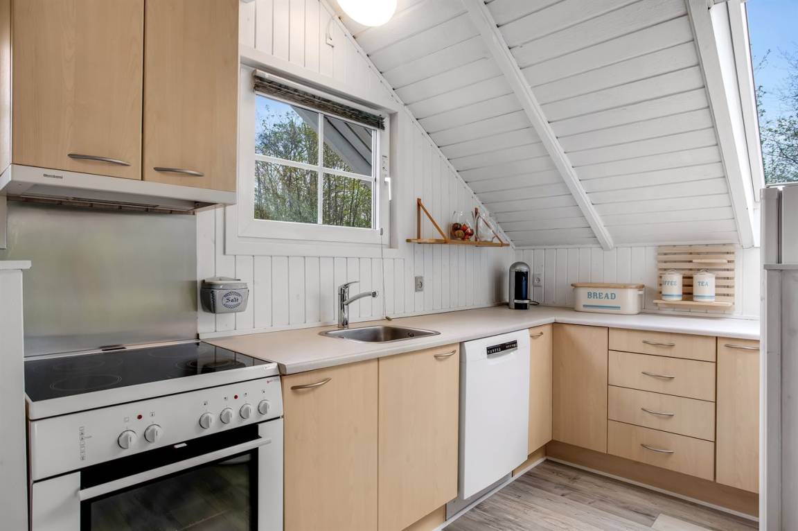 Das Innere des Ferienhauses ist hell und freundlich, und wenn Sie das Wohnzimmer betreten, werden Sie sofort die schöne Decke bemerken, die ein Gefühl von Räumlichkeit, Gemütlichkeit und Charme verleiht. Die große Couch lädt zum Faulenzen ein und der Kaminofen sorgt für ein gemütlichs Ambiente und ist perfekt für kühle Abende.