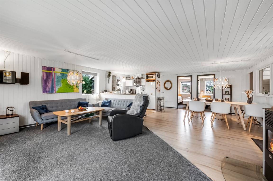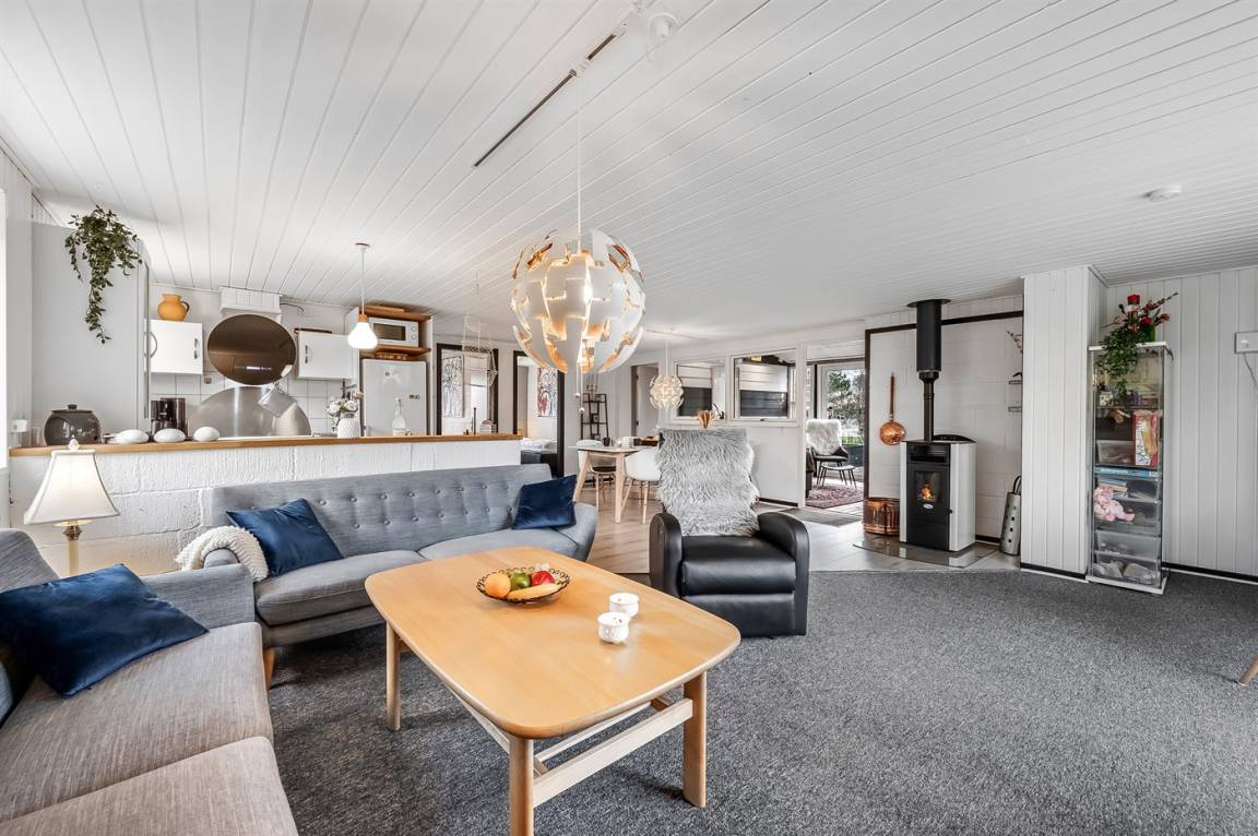 DraußenDie Ferienunterkunft liegt auf einem 1054 m² großen Naturgrundstück. Das Grundstück ist eingezäunt. Die Entfernung zum Meer beträgt 7000 m. Die Entfernung zum Fjord beträgt 32 m. Die nächste Einkaufsmöglichkeit liegt 600 m entfernt. Es steht ein offenes Terrassenareal zur Verfügung. Zutritt zu einem Wintergarten. Die Entfernung zu einem Spielplatz beträgt 100 m.Lagerfeuerstelle. Windschutzhütte. Parkplatz auf dem Grundstück.