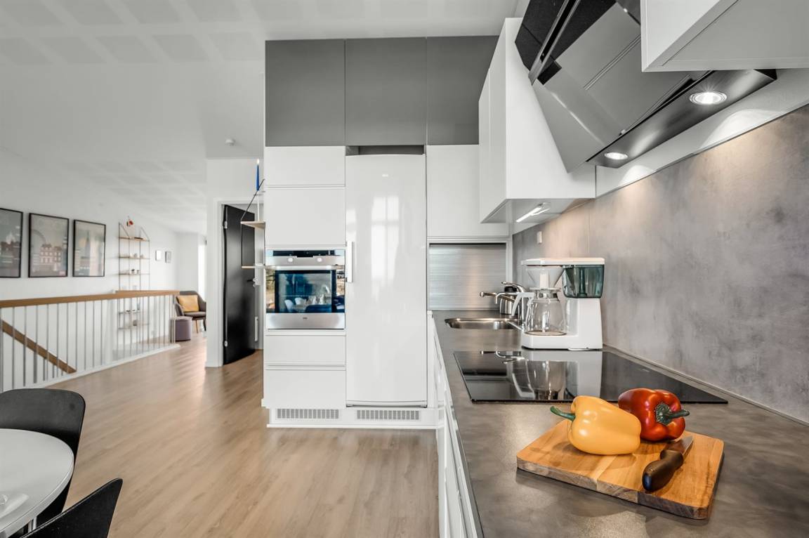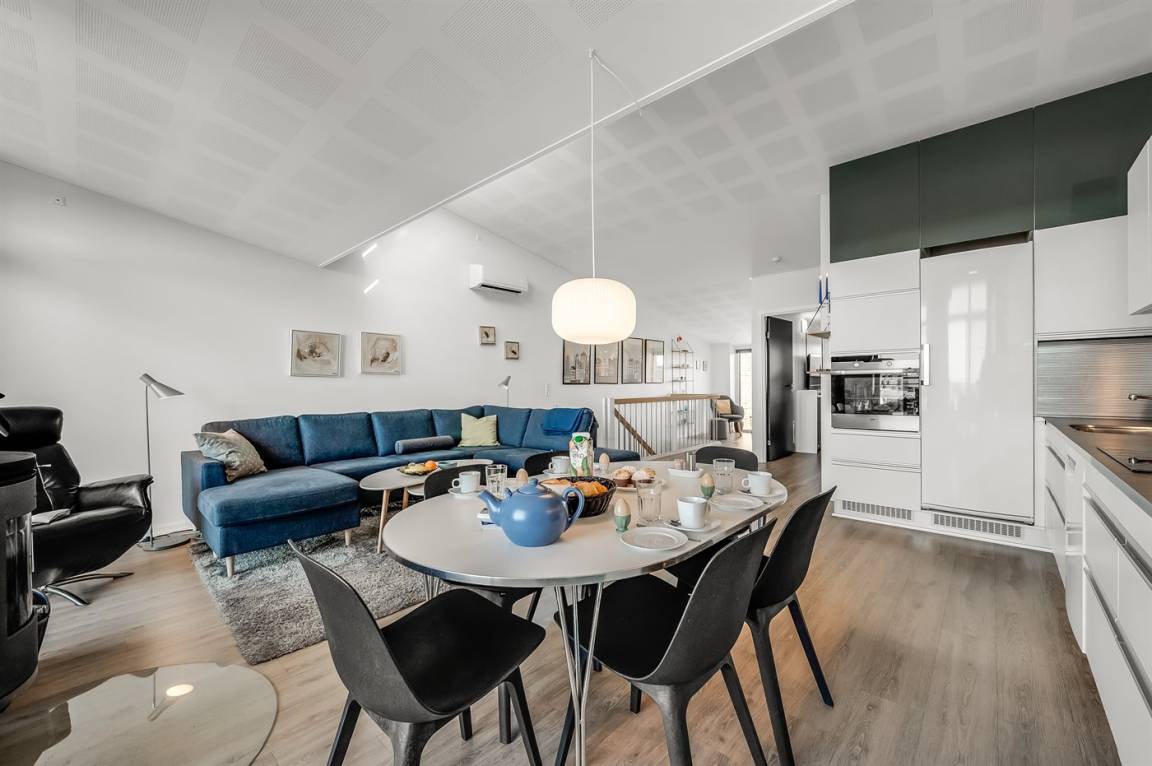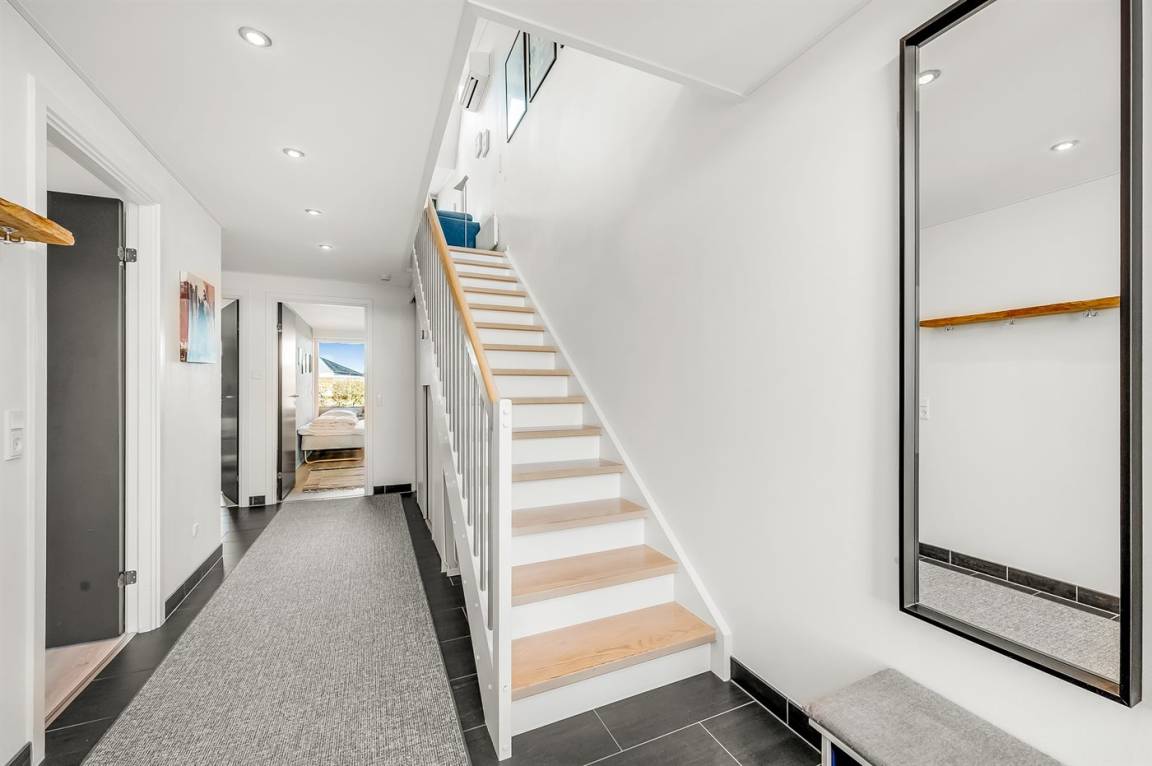 DraußenDie Ferienunterkunft liegt auf einem 170 m² großen Naturgrundstück. Die Entfernung zum Fjord beträgt 100 m. Die nächste Einkaufsmöglichkeit liegt 100 m entfernt. Es steht ein offenes Terrassenareal zur Verfügung. Außerdem gibt es überdachte Terrasse.Balkon im Obergeschoss. Es ist ein Ladestecker für Elektroautos installiert. CCS-Stecker (Combo-Stecker). Mit einer Ladeleistung von 11 kW. Parkplatz auf dem Grundstück.