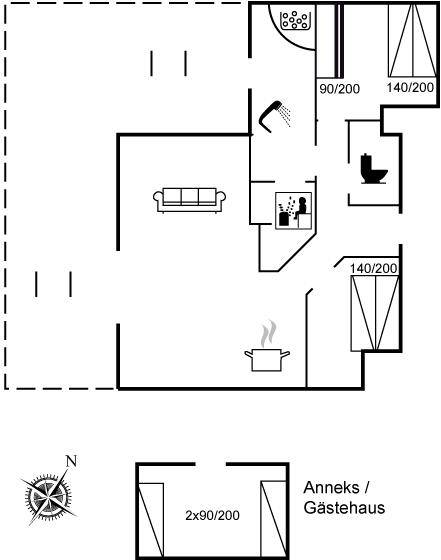 SchlafverhältnisseDie Schlafplätze verteilen sich auf 3 Schlafräume. 4 Schlafplätze in Doppelbetten. 2 Schlafplätze in Einzelbetten. 2 Schlafplätze in einem Etagenbett. 2 von diesen Schlafplätzen befinden sich im Gästehaus.