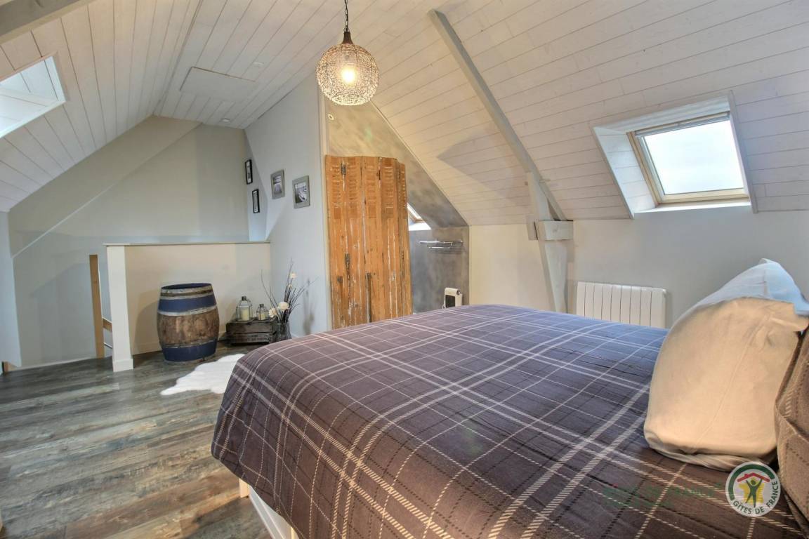 Im Obergeschoss befindet sich ein großes Schlafzimmer (mit einem 160x200 cm großen Bett) mit angrenzendem Badezimmer (große Dusche). Waschmöglichkeiten stehen zur Mitbenutzung zur Verfügung.