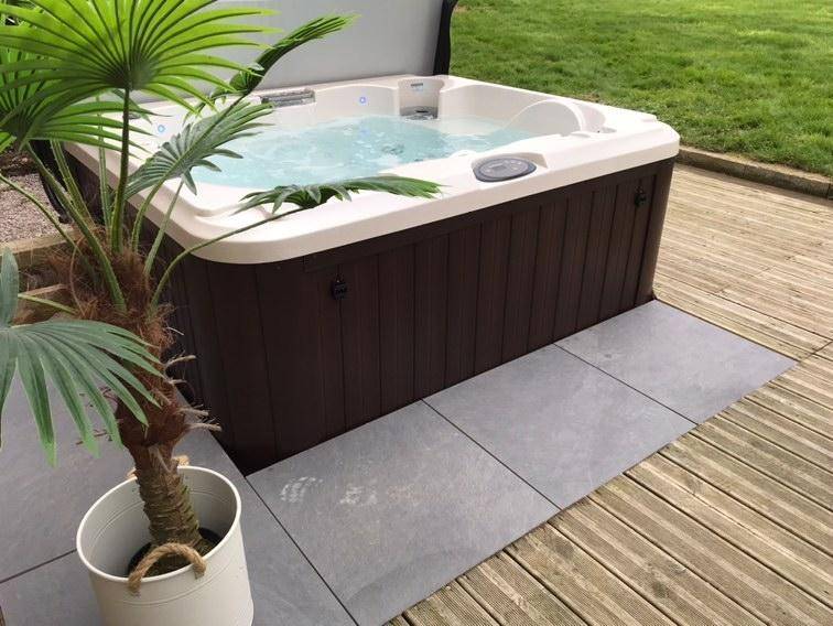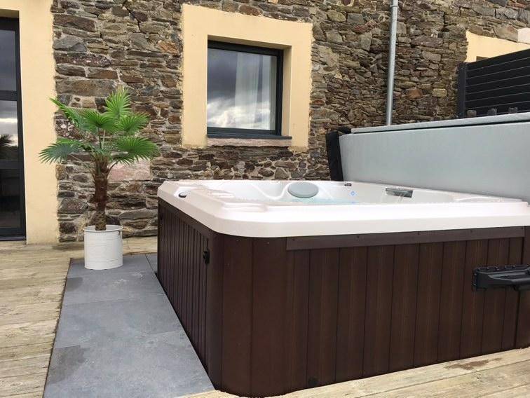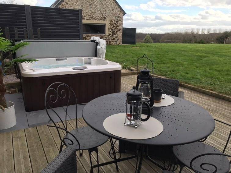 Eine private 30 m² große Terrasse mit Whirlpool und Blick ins Grüne.