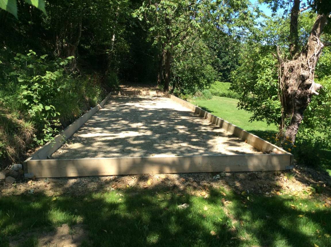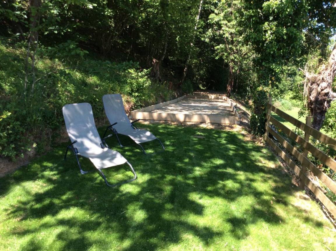 Außenbereich: Private, gepflasterte Terrasse (20 m²) in Südostlage, privater Innenhof (70 m²) hinter dem Haus (Parkplatz) und ein Bouleplatz am Hang mit Blick ins Tal. Tischtennis- und Badminton-Ausrüstung stehen ebenfalls zur Verfügung.