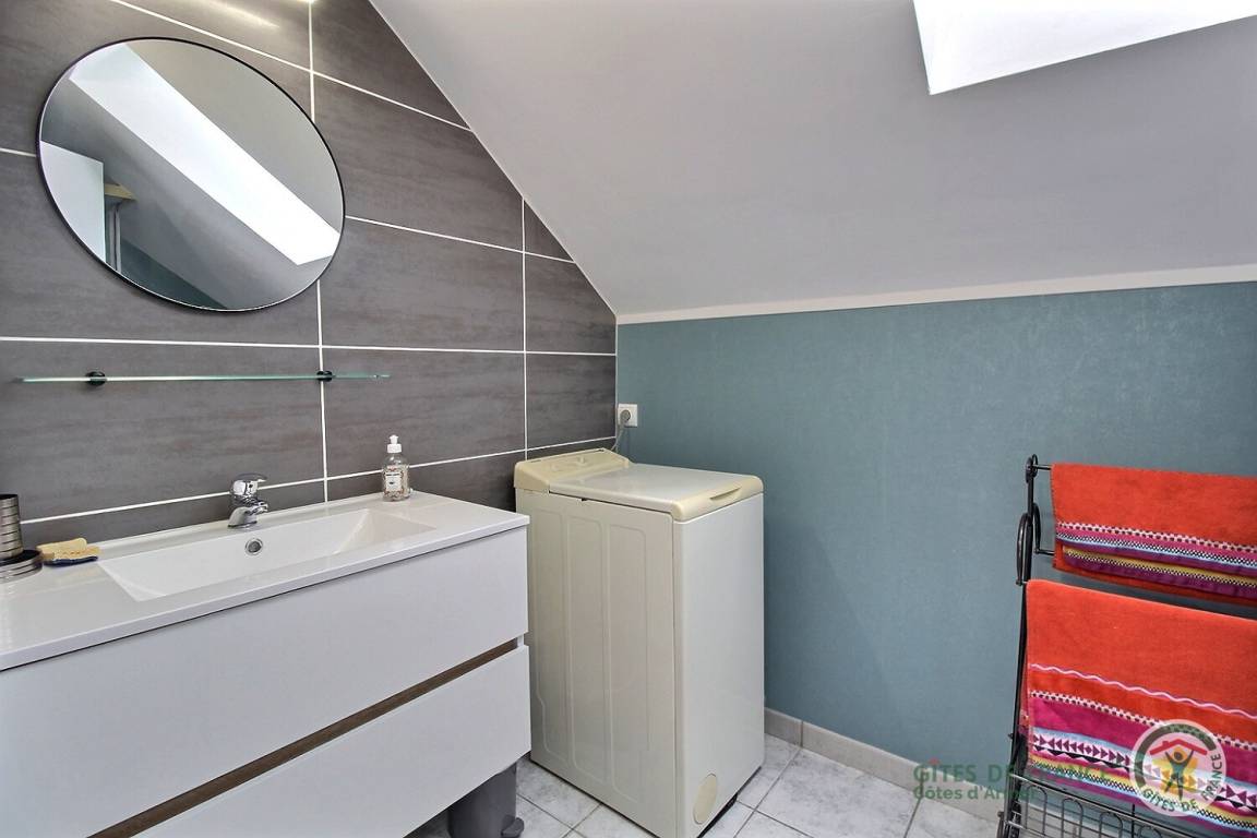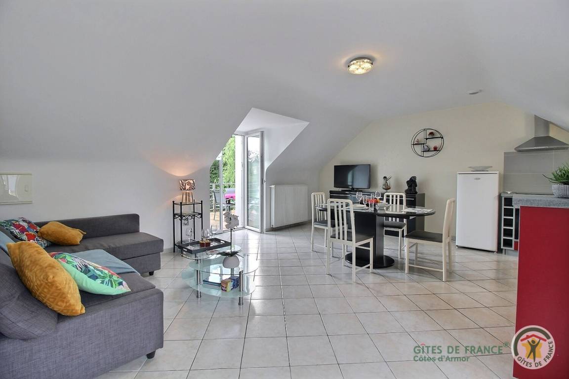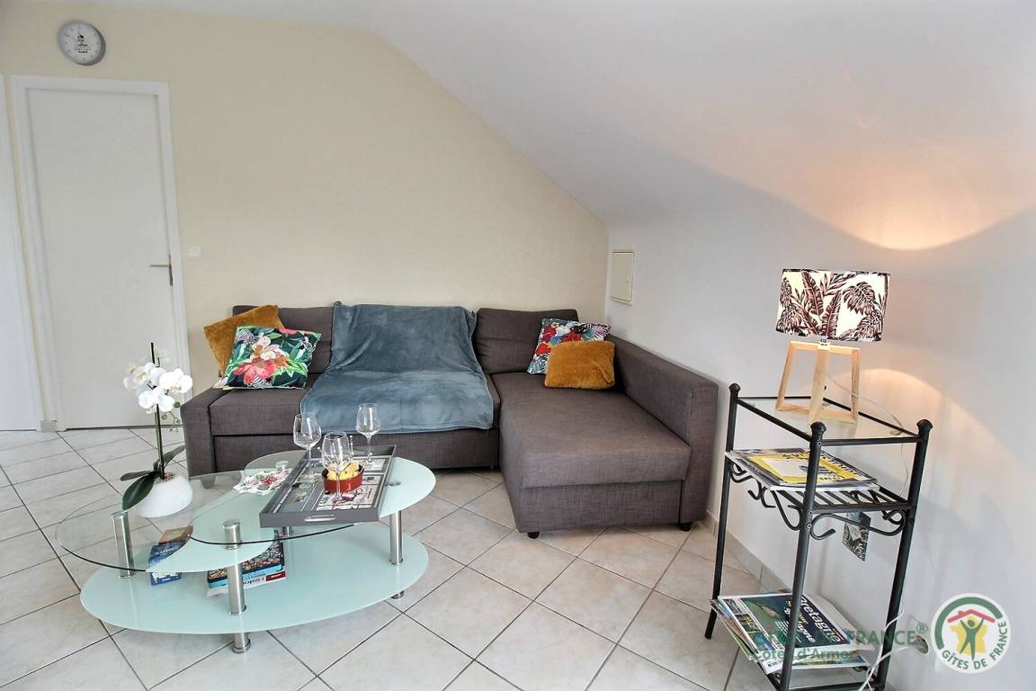Ihre Ferienwohnung umfasst im Obergeschoss und auf der gleichen Ebene: Wohnzimmer (Schlafsofa) mit Einbauküche, 1 Schlafzimmer (1 Bett 160x200) mit Verbindungstür zum Badezimmer (Dusche und Waschmaschine), separates WC. 16 m² große Terrasse mit elektrischem Wassergrill. Großer Innenhof, Carport mit Abstellmöglichkeit für Fahrräder. Über der Garage der Eigentümer eingerichtetes Ferienhaus, das es nicht in Anwesenheit von Urlaubern benutzt. 2 Ladestationen für Elektrofahrzeuge im Dorf vorhanden, 1 km entfernt.