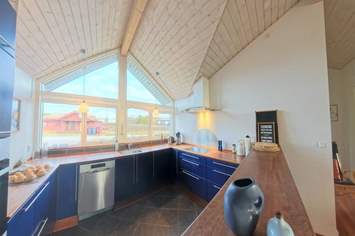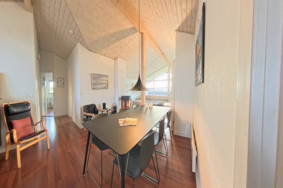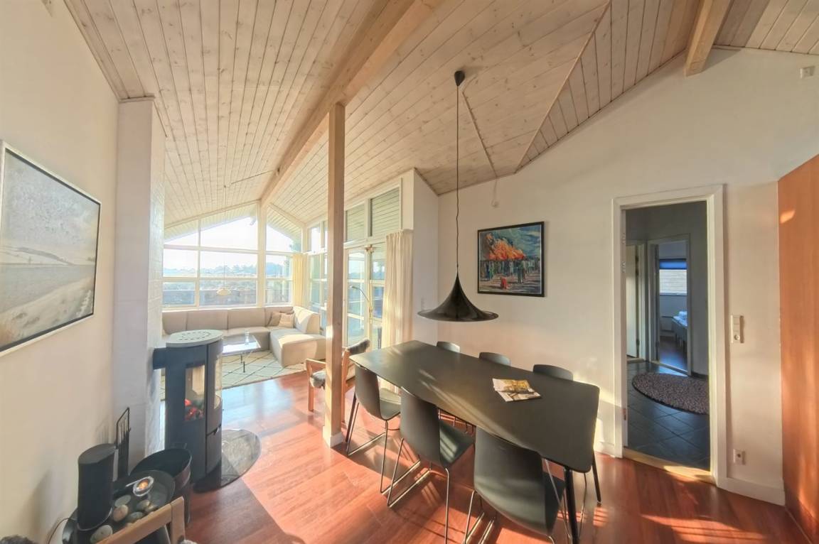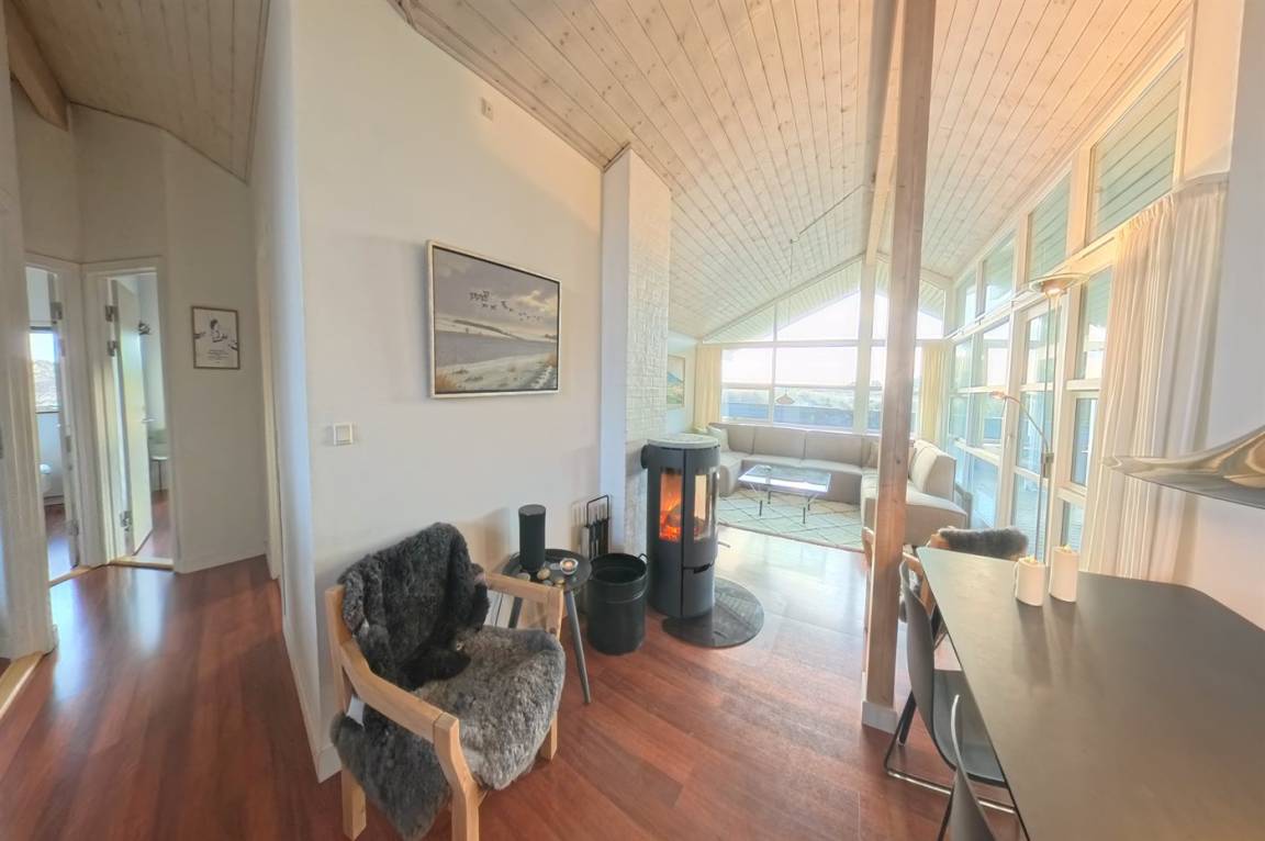 Hier wohnst du direkt an einem geschützten Naturgebiet, wo dich Weite, Ruhe und der schöne Blick auf die charakteristische Dünenlandschaft erwarten. Das Haus verfügt über ein helles, einladendes Wohnzimmer in offener Verbindung mit der Küche. Große Fenster sorgen dafür, dass die Natur fast Teil des Wohnraums wird. Hier kannst du entspannte Mahlzeiten, ein Feuer im Kaminofen oder ganz einfach die Aussicht auf die Natur genießen.