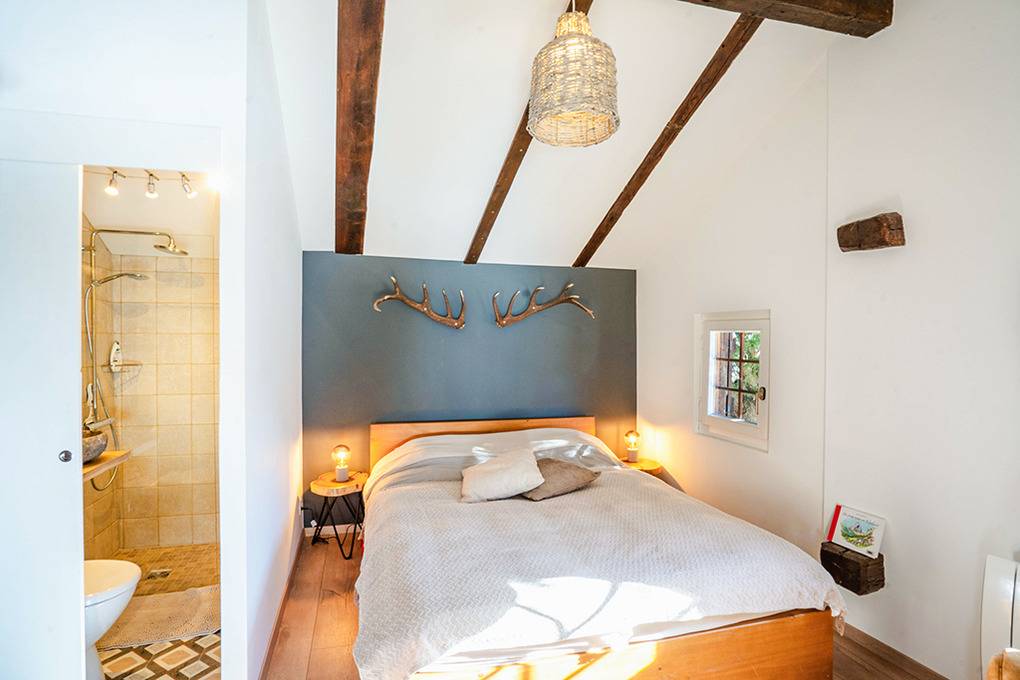 Stadel (im Garten): Schönes Doppelzimmer, großzügig bis zum Dachboden ausgebaut. Bad: Du, Wb, WC.
