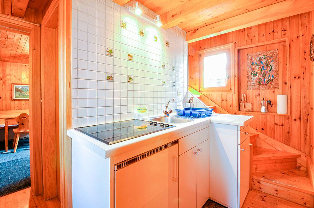 Hochparterre: Wohn-/Essraum (15 qm) mit Kaminofen, Esstisch, räumlich abgetrennter Küchenzeile (Mini-Ofen). Doppelzimmer. Separates WC.