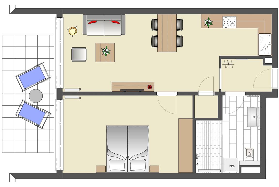 59 m² Ferienwohnung ∙ 1 Schlafzimmer ∙ 4 Gäste