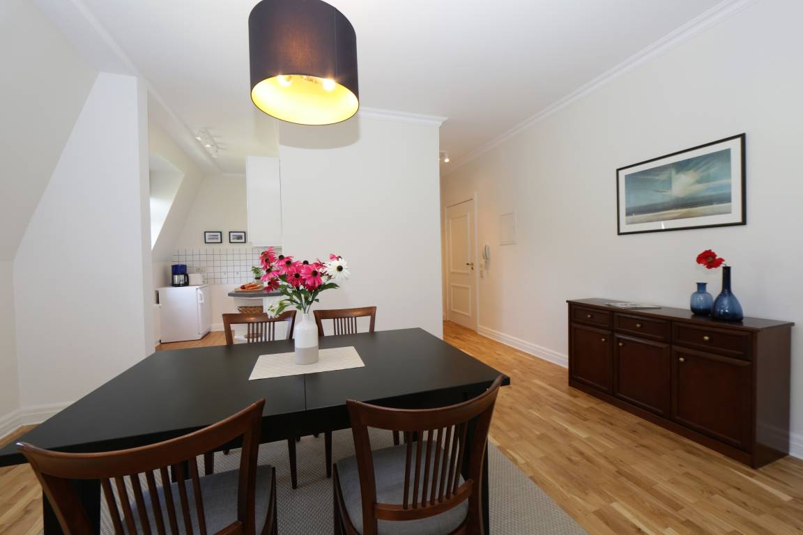 Dieses moderne und ruhig gelegene, mit 63 m² großzügige 2-Zimmer Appartement liegt im 3. Obergeschoss und ist für 2 Erwachsene und 2 Kinder geeignet. Der Wohnbereich ist mit einem Sofa mit Schlaffunktion (Liegefläche 160 x 180), Sessel und Couchtisch eingerichtet. Flat TV und Radio sind selbstverständlich. Die helle Loggia zur Seeseite, von der aus Sie einen kleinen Blick auf das Meer erhaschen können, lädt zum Lesen genauso ein wie zu einer gemütlichen Tasse Tee. Am Schreibtisch, der sich ebenfalls in der Loggia befindet, können die Gäste ihre Urlaubspost erledigen. An den zum Wohnbereich offenen Essbereich, der 4 Personen Platz bietet, grenzt die halboffene Vollküche mit Cerankochfeld, Backofen, Geschirrspüler, Kühlschrank mit Gefrierfach pp. Das geräumige Schlafzimmer ist mit einem Doppelbett und einem Kleiderschrank eingerichtet. Das Bad ist mit Dusche sowie Waschbecken/WC ausgestattet. Ein Parkplatz auf dem Grundstück ist der Wohnung zugeordnet, Waschmaschine und Trockner stehen zu Ihrer Verfügung.